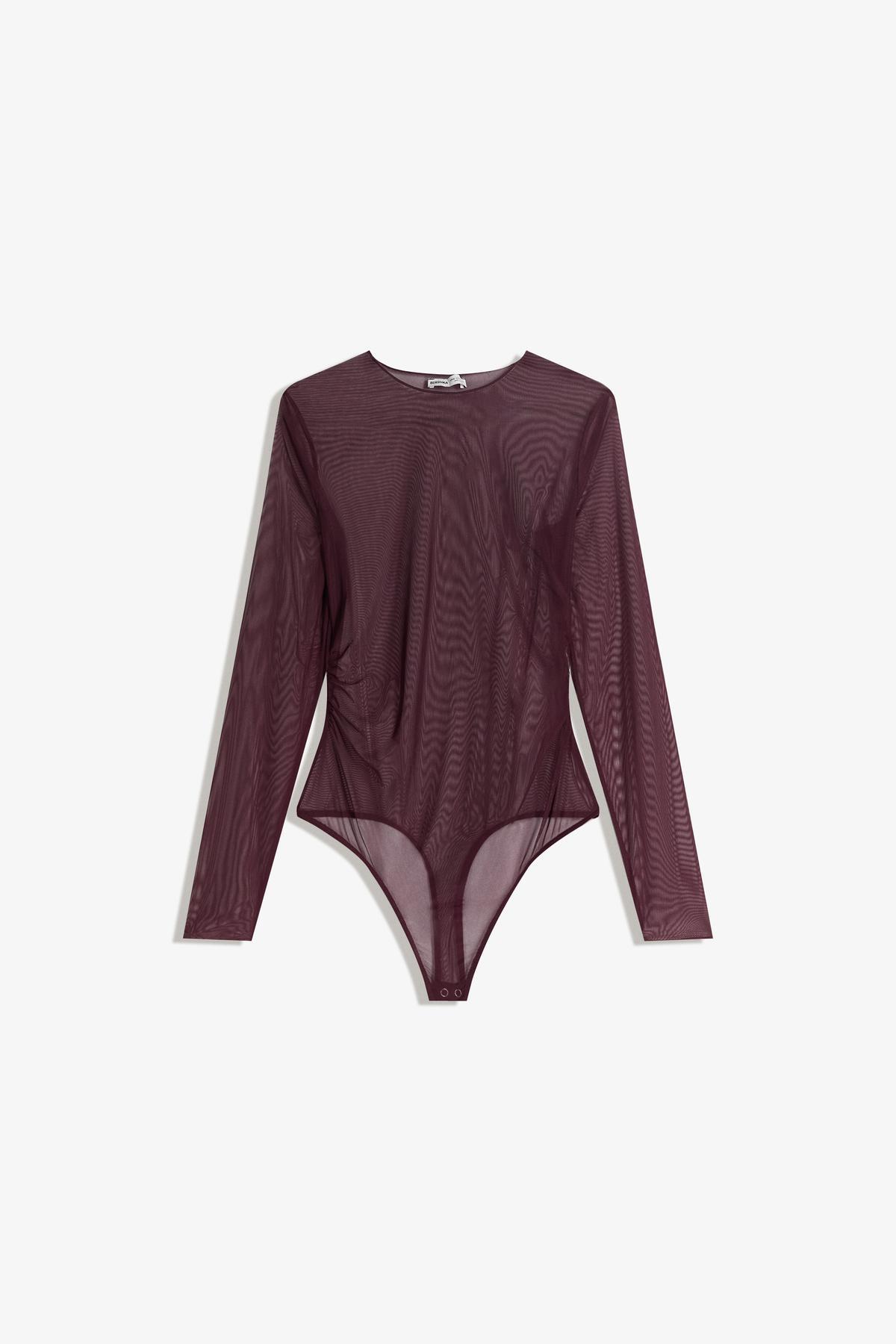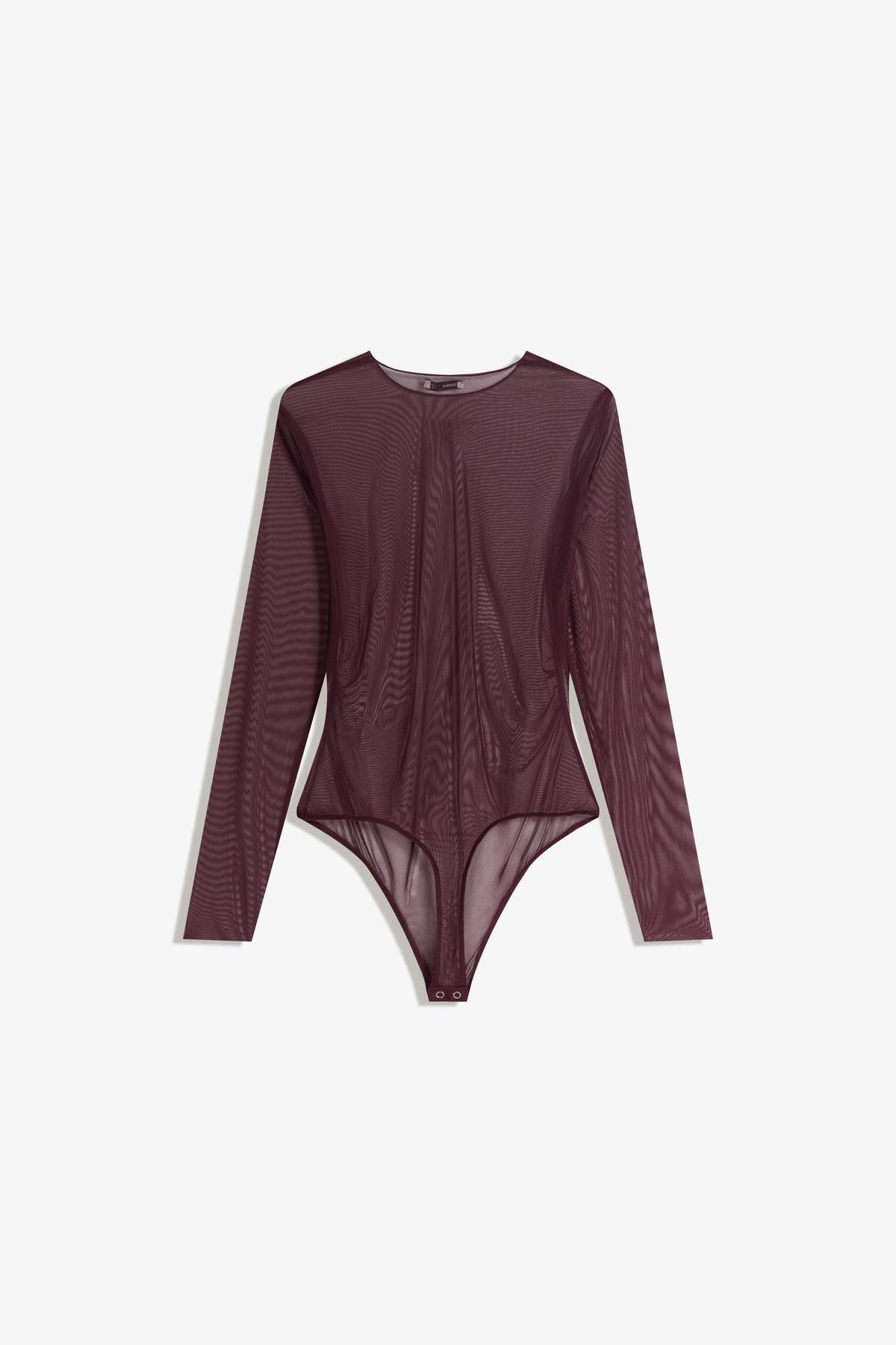 Long sleeve tulle body 87% polyester - 13% elastane CANNOT BE ROLLER CLEANED, CANNOT BE USED WITH BLEACHER, USE A WASHING BAG, CANNOT BE DRY CLEANED, MACHINE DELICATE WASHING AT 30ºC, IRONING AT 110ºC.