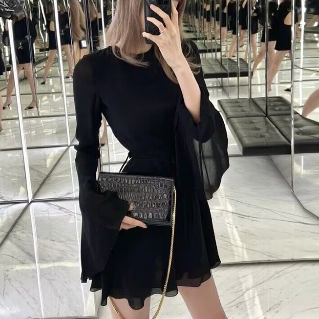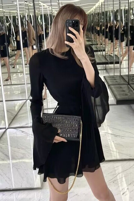 Product information :Fabric: polyester (polyester fiber)Sleeve type: flared sleeveWaist type: middle waistCollar type: round neckColor classification: blackSize Information:Size: S M LPacking list:Dress *1