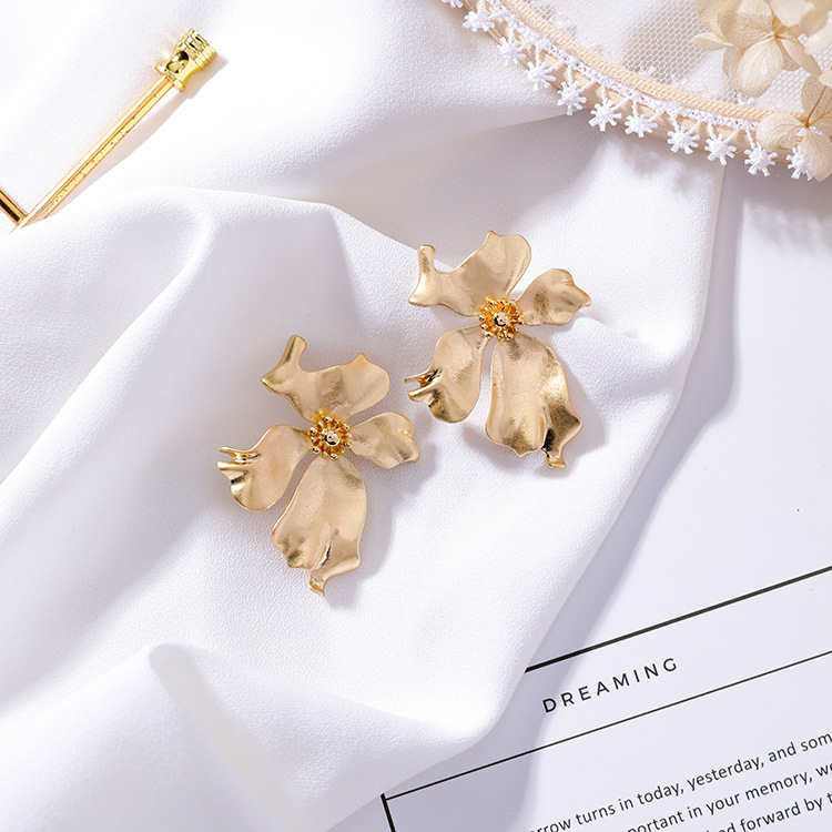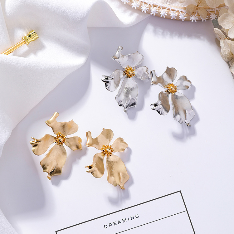 Retro texture metal three-dimensional flower earrings fashion exaggerated atmosphere earrings personality cold wind cross-earth earrings female