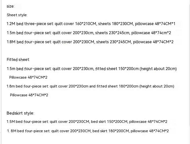 Applicable bed size: 1.2m bed three piece set (one pillowcase) 1.5m bed four piece set (duvet cover 200 * 230cm) 1.8m bed four piece set (duvet cover 200 * 230cm)