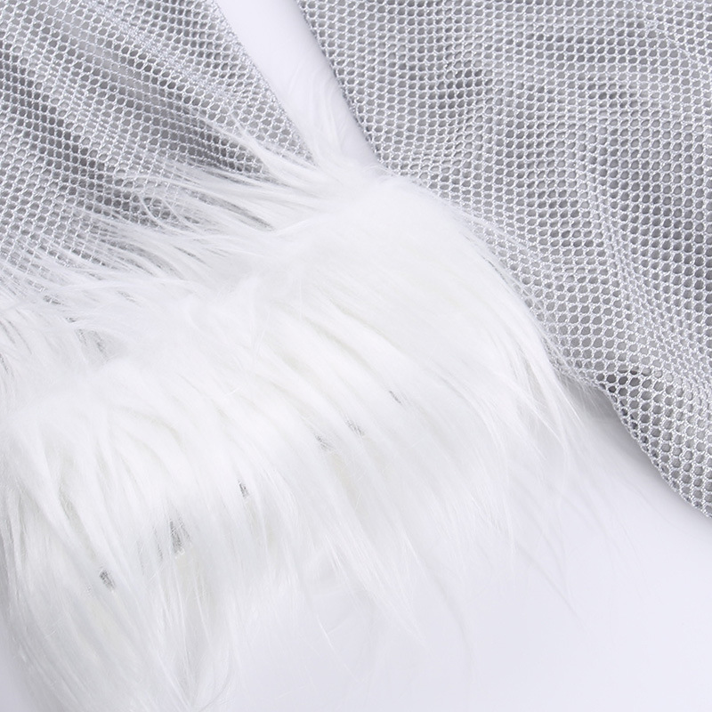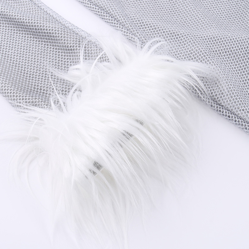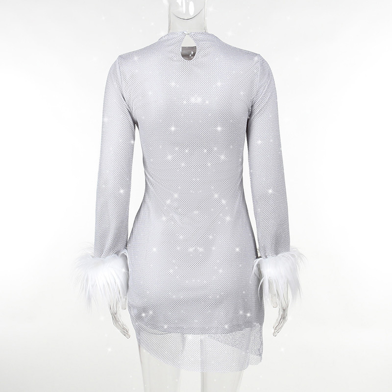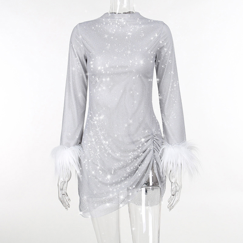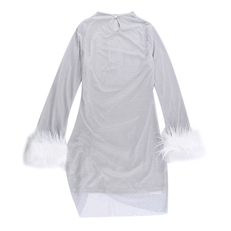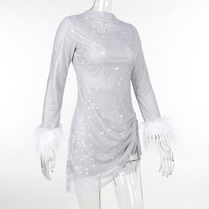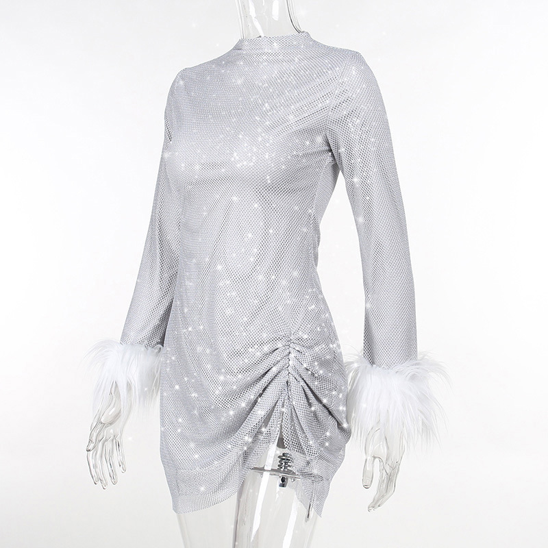 Fashionable Slim-fit Shiny Mesh Fur Cuff Pleated Dress Women