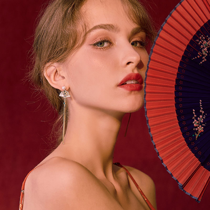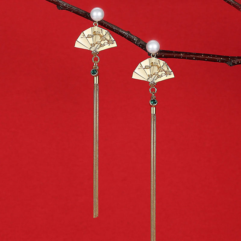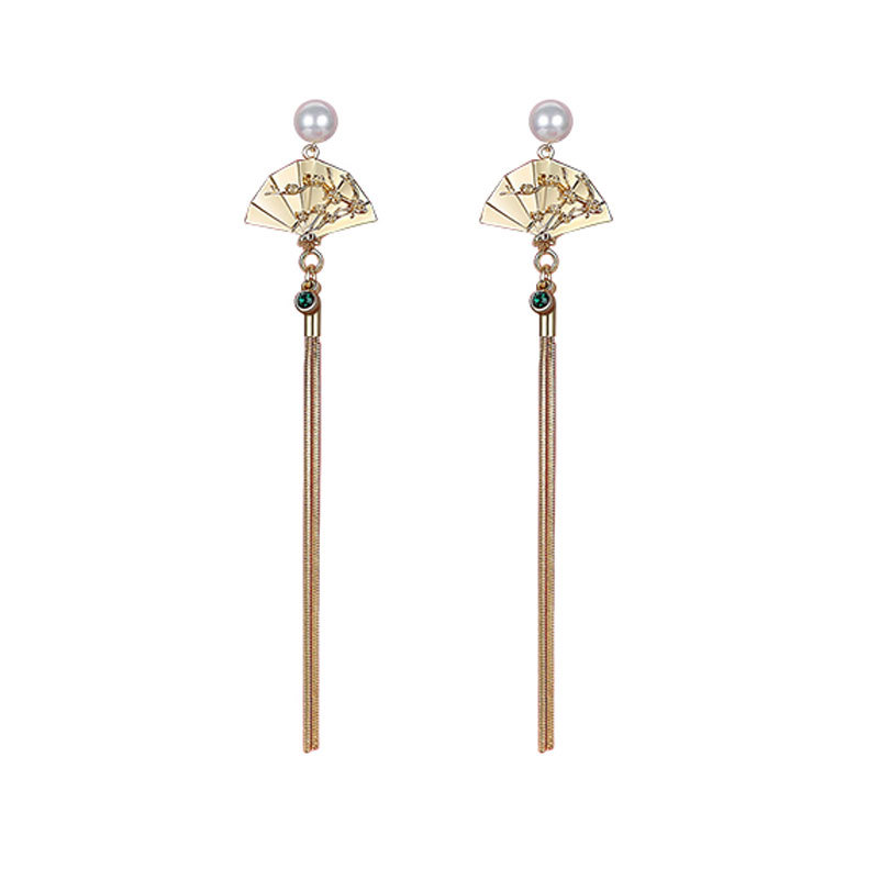 Color :Silver needle: golden fan + long tassel earrings