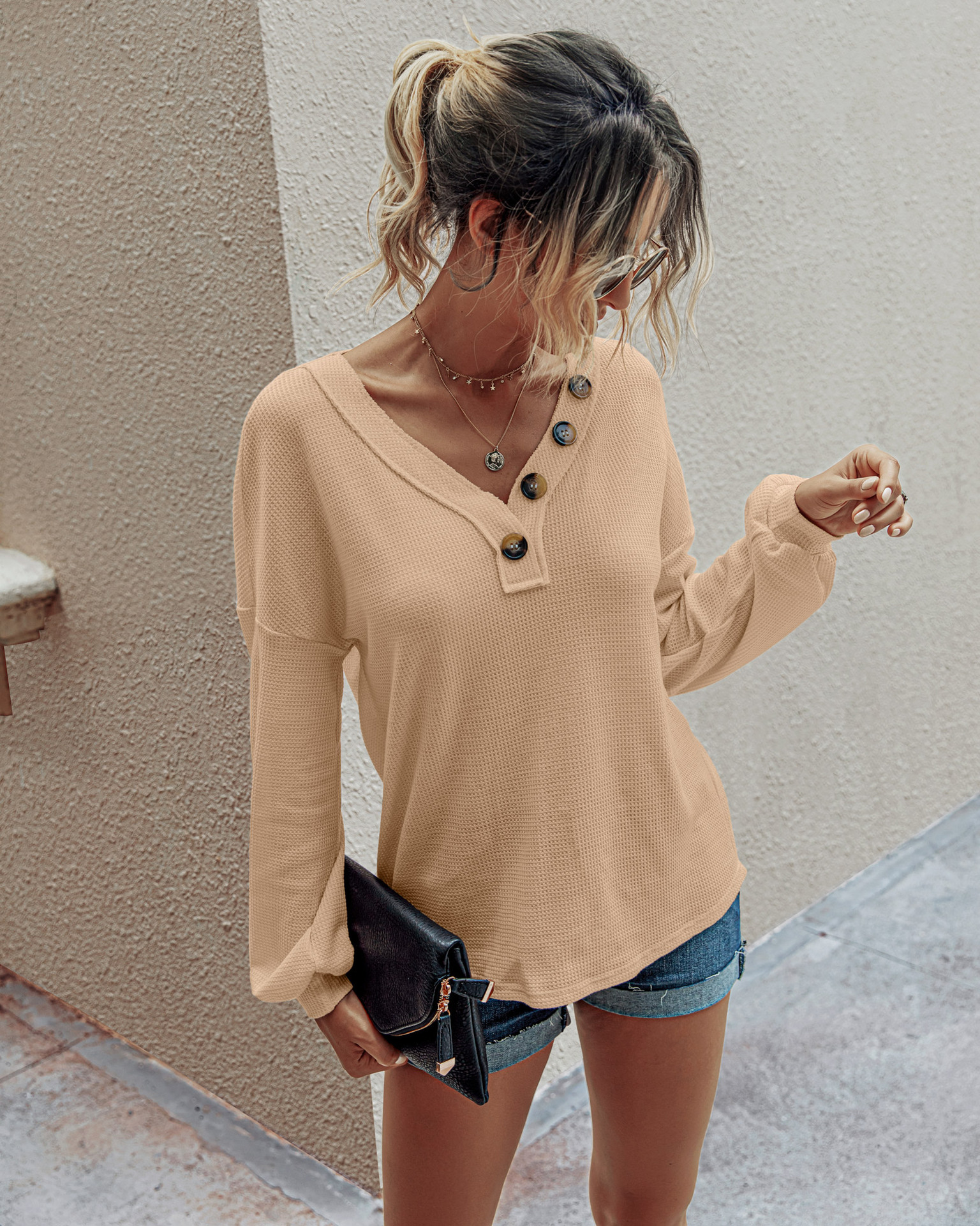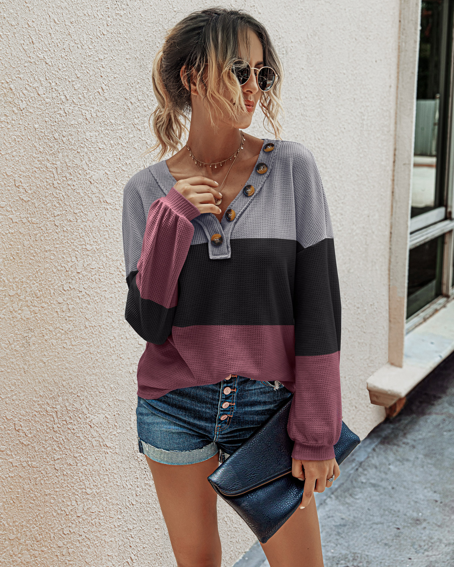 Popular elements: contrast color, stitching, solid color buttons V-neck