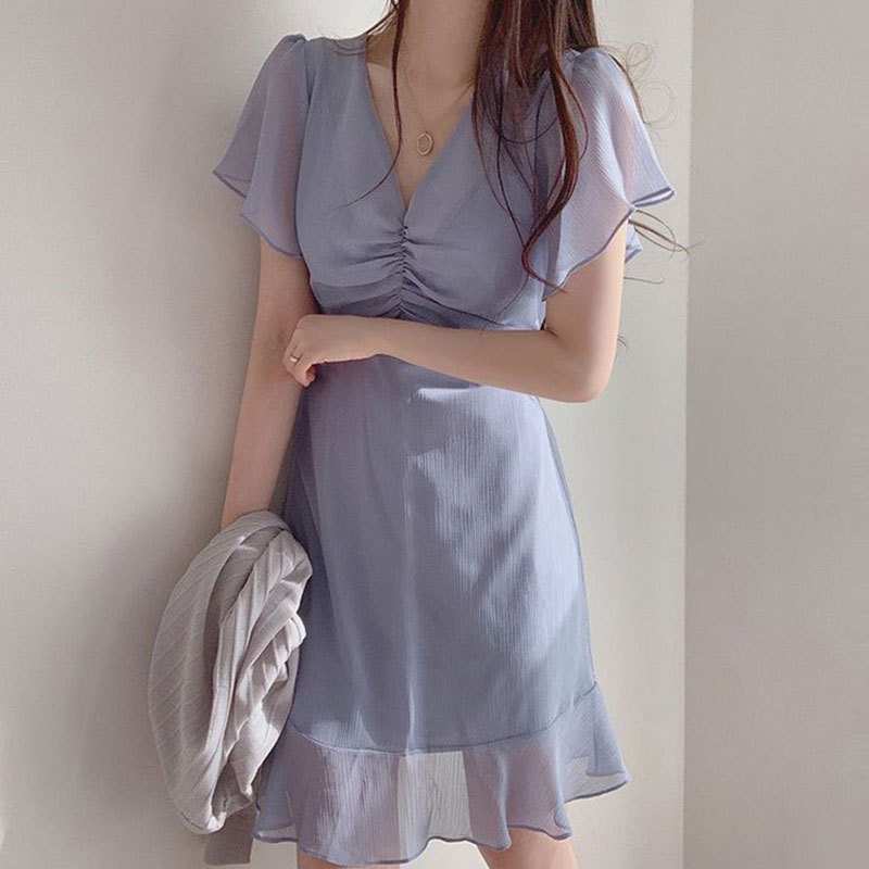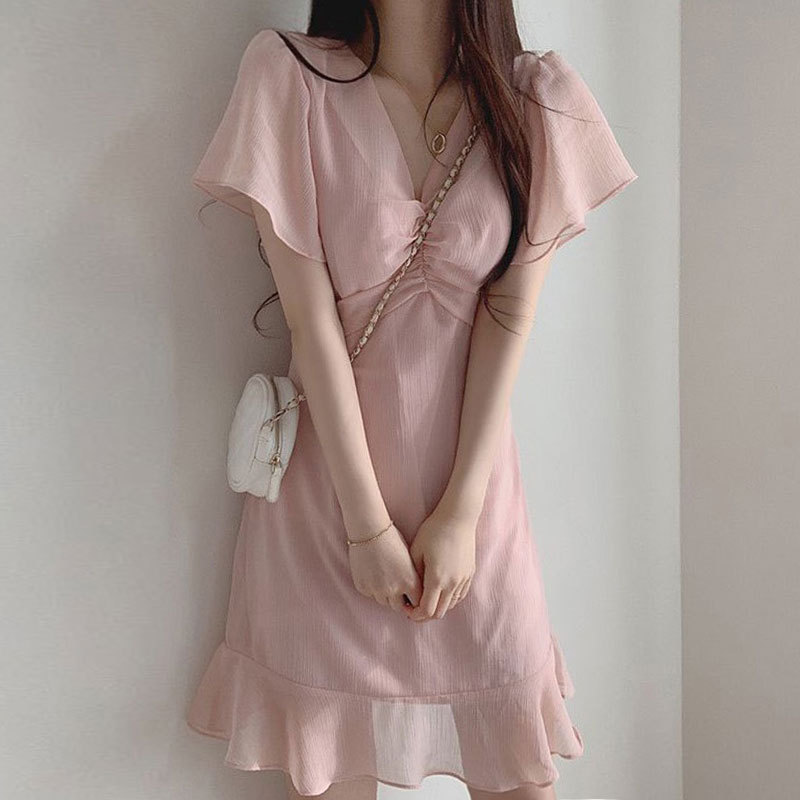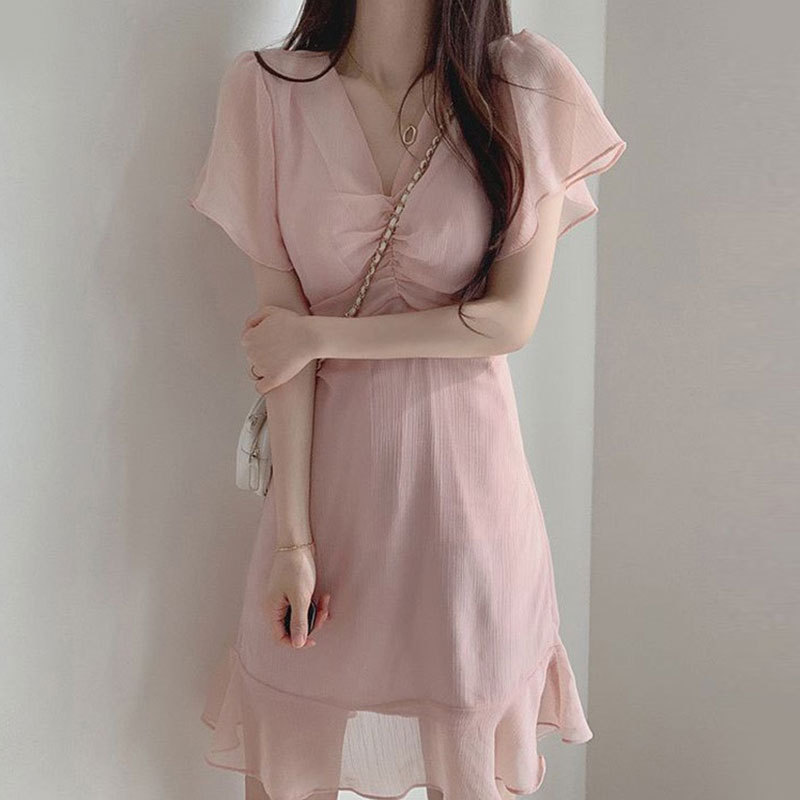 Product information :Skirt ruffle skirtNeck V-neckSleeve length: short sleeveWaist type: high waistColor white, pink, blue