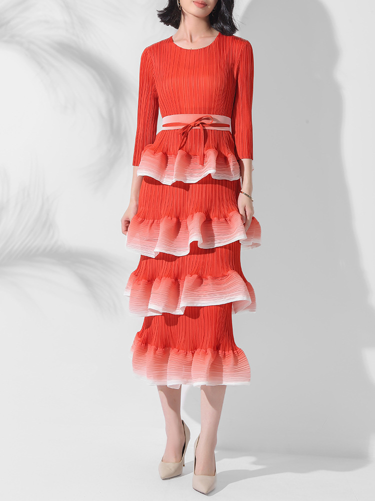 Product information: Pattern: gradient Skirt type: pleated skirt Color: purple, red, blue green, black, blue, rose Red Size: free size Style type: temperament commute Popular elements: ruffles Style: pullover Fabric name: Polyester Fiber