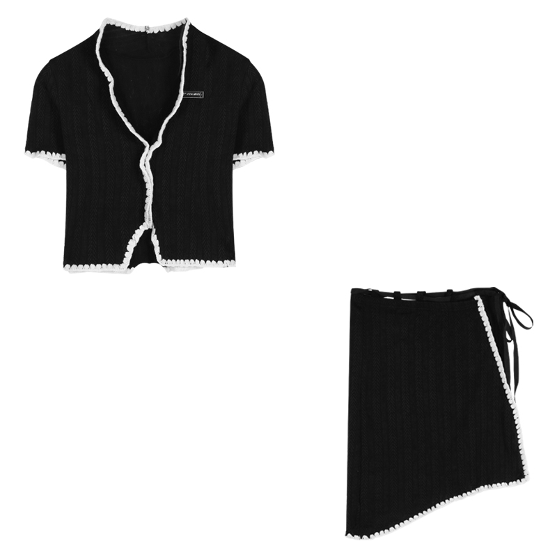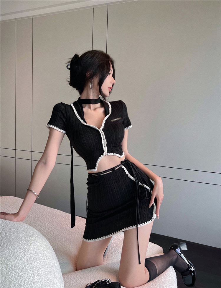 Color: black top black skirt