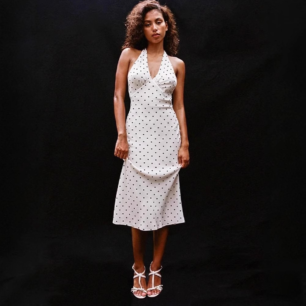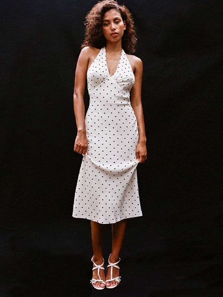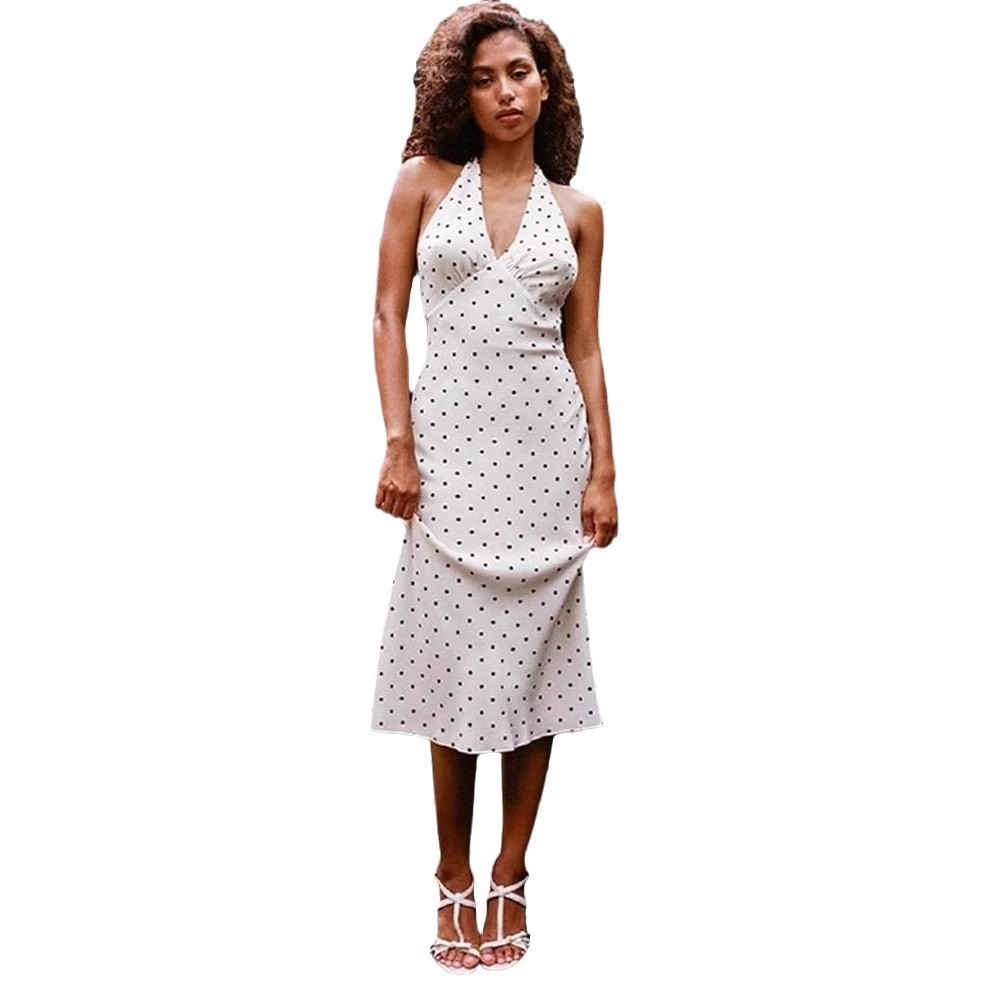 Product information: Pattern: Dots Skirt type: hip skirt Color: White Size: S,M,L,XL Style type: private clothing socialite Popular elements: Dots Style: Halter Fabric name: Polyester Style: sexy style Process: splicing
