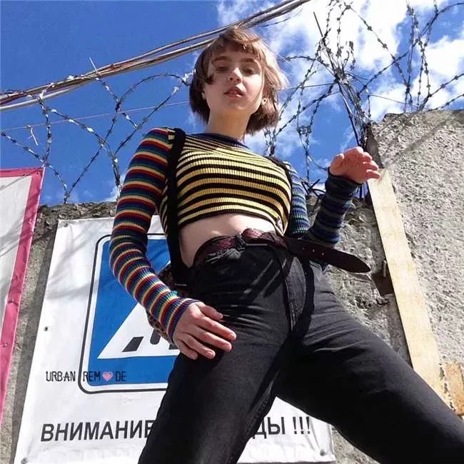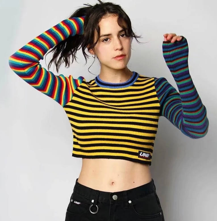 Stitched Contrast Top Short Striped Navel T-Shirt
