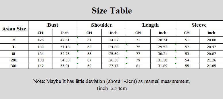 1. Asian sizes are 1 to 2 sizes smaller than European and American people. Choose the larger size if your size between two sizes. Please allow 2-3cm differences due to manual measurement. 2. Please check the size chart carefully before you buy the item, if you don't know how to choose size, please contact our customer service. 3.As you know, the different computers display colors differently, the color of the actual item may vary slightly from the following images.