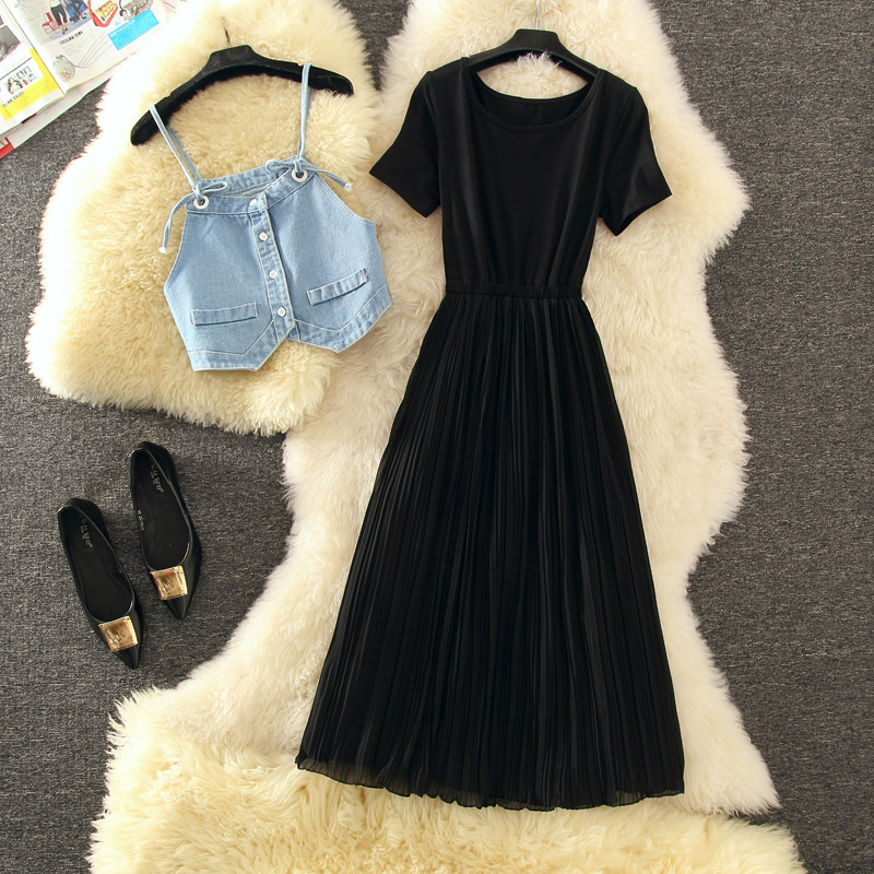 Fabric: Denimpattern: plainWaist type: elastic waistClothing placket: hedgingCombination form: two-pieceSkirt type: A-line skirtsleeve length: short sleeveSkirt length: mid-length skirtStyle: strap