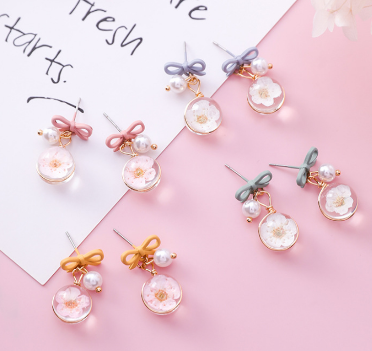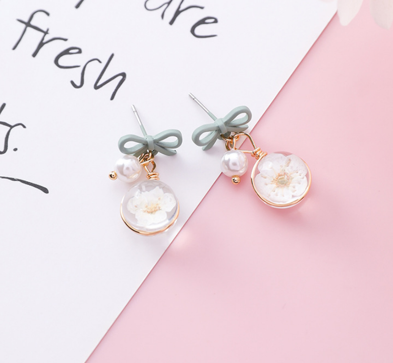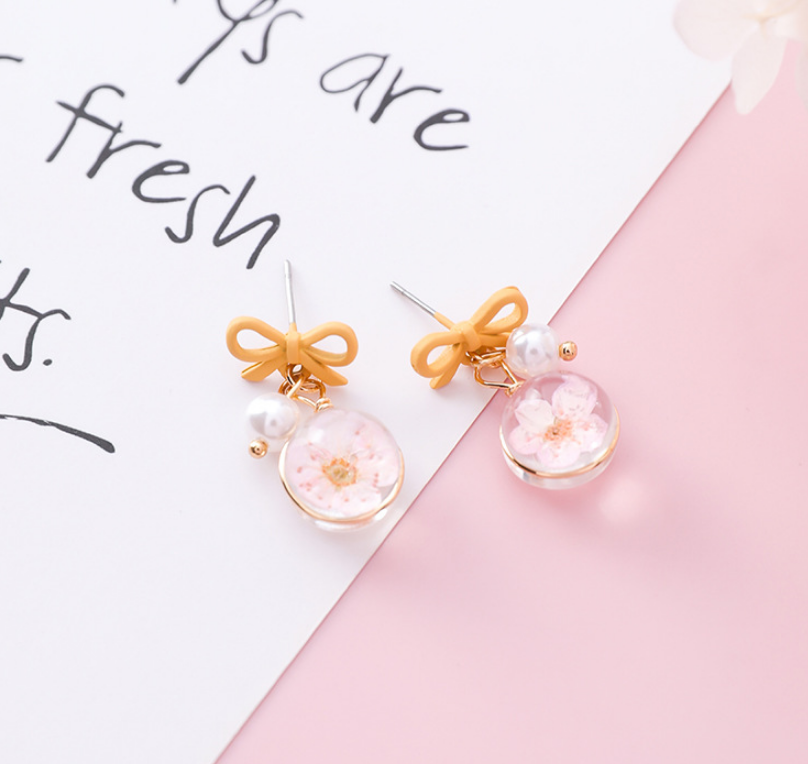 Korean girl heart bow pearl flower earrings sweet glass cherry blossom bulb earrings wild earrings