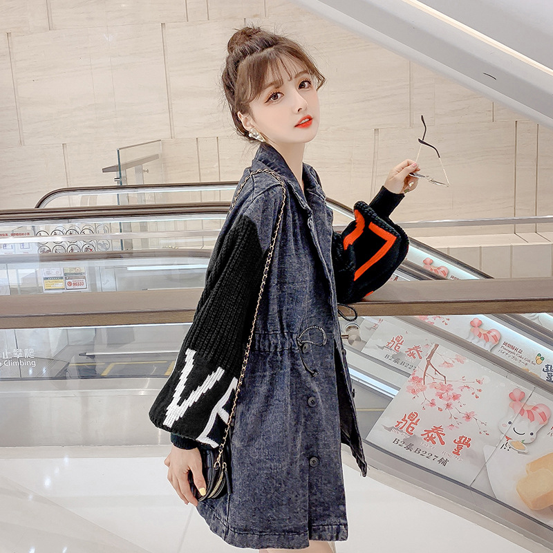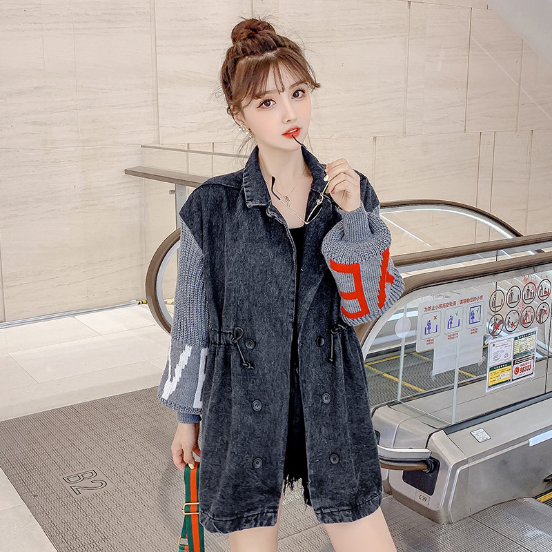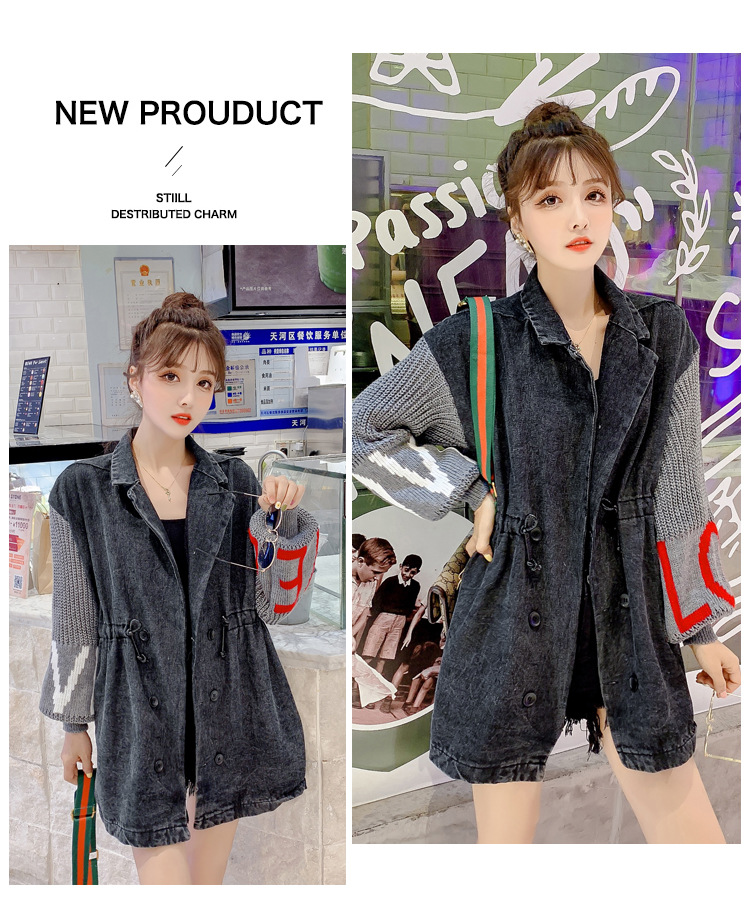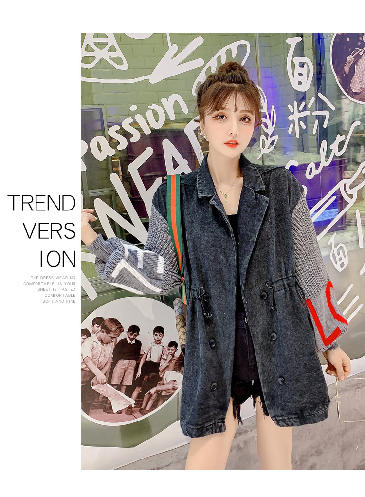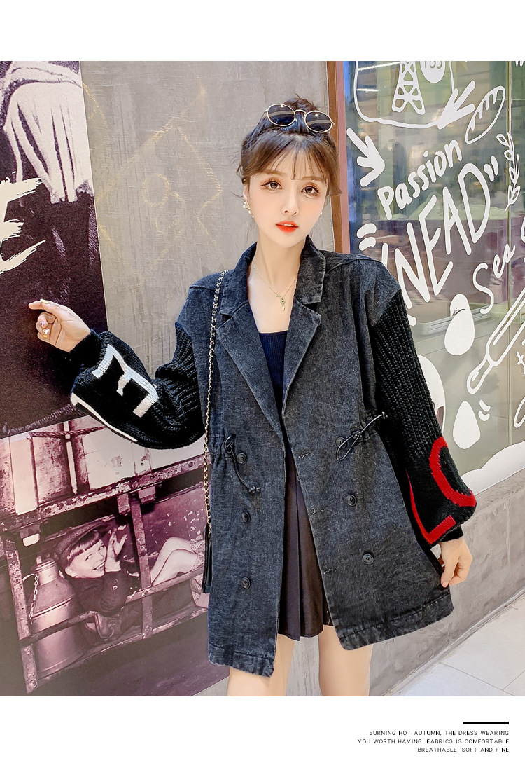 Black denim jacket with knit lettered lantern sleeve