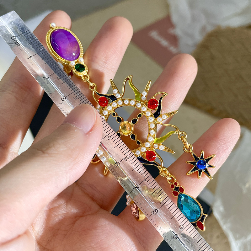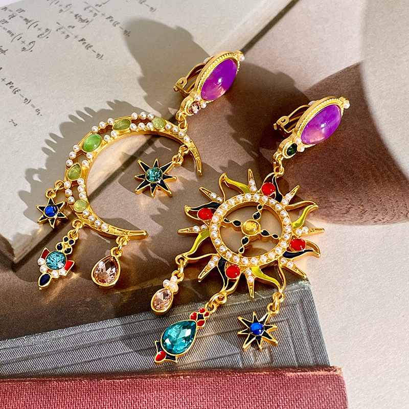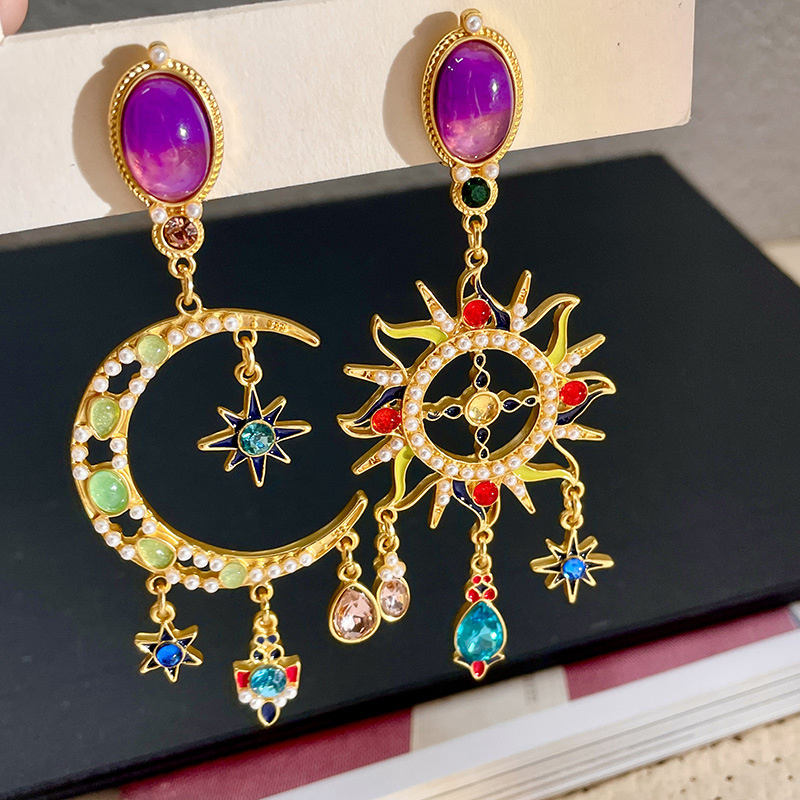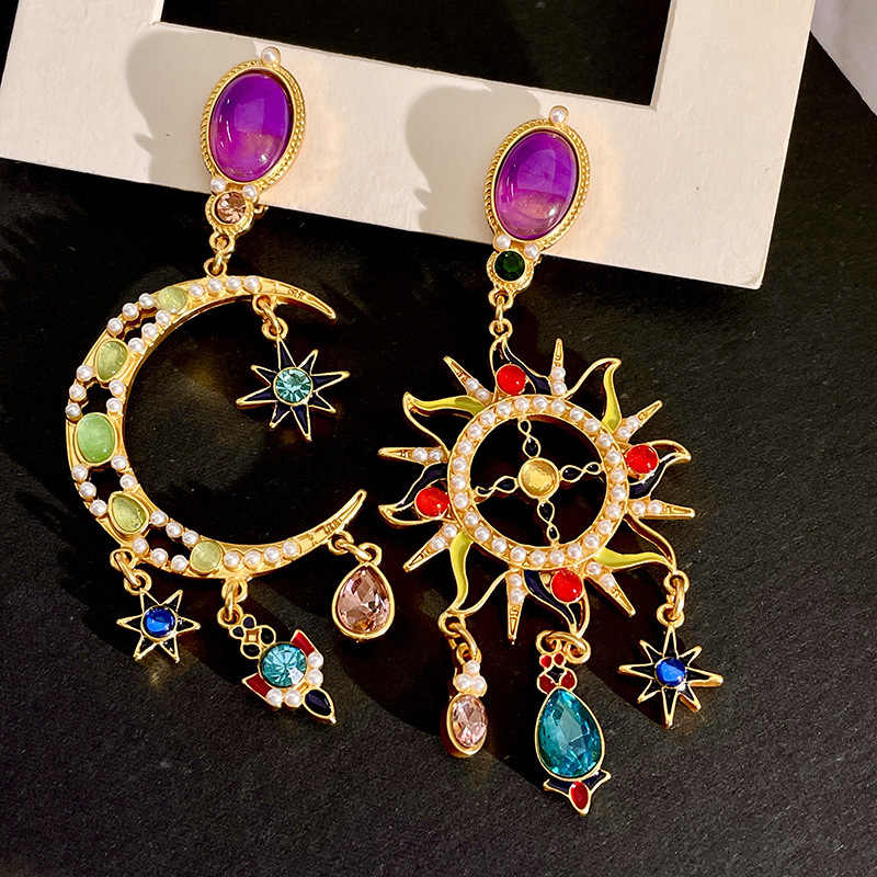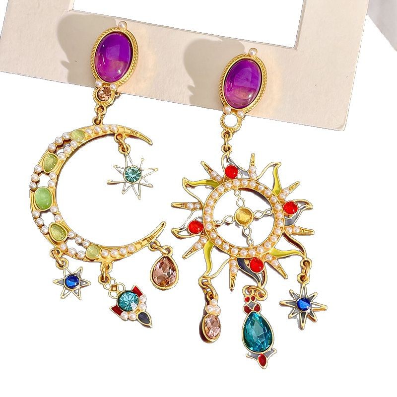 Mid-ancient Special-interest Design Colored Glaze Crystal Moon Asymmetric Earrings