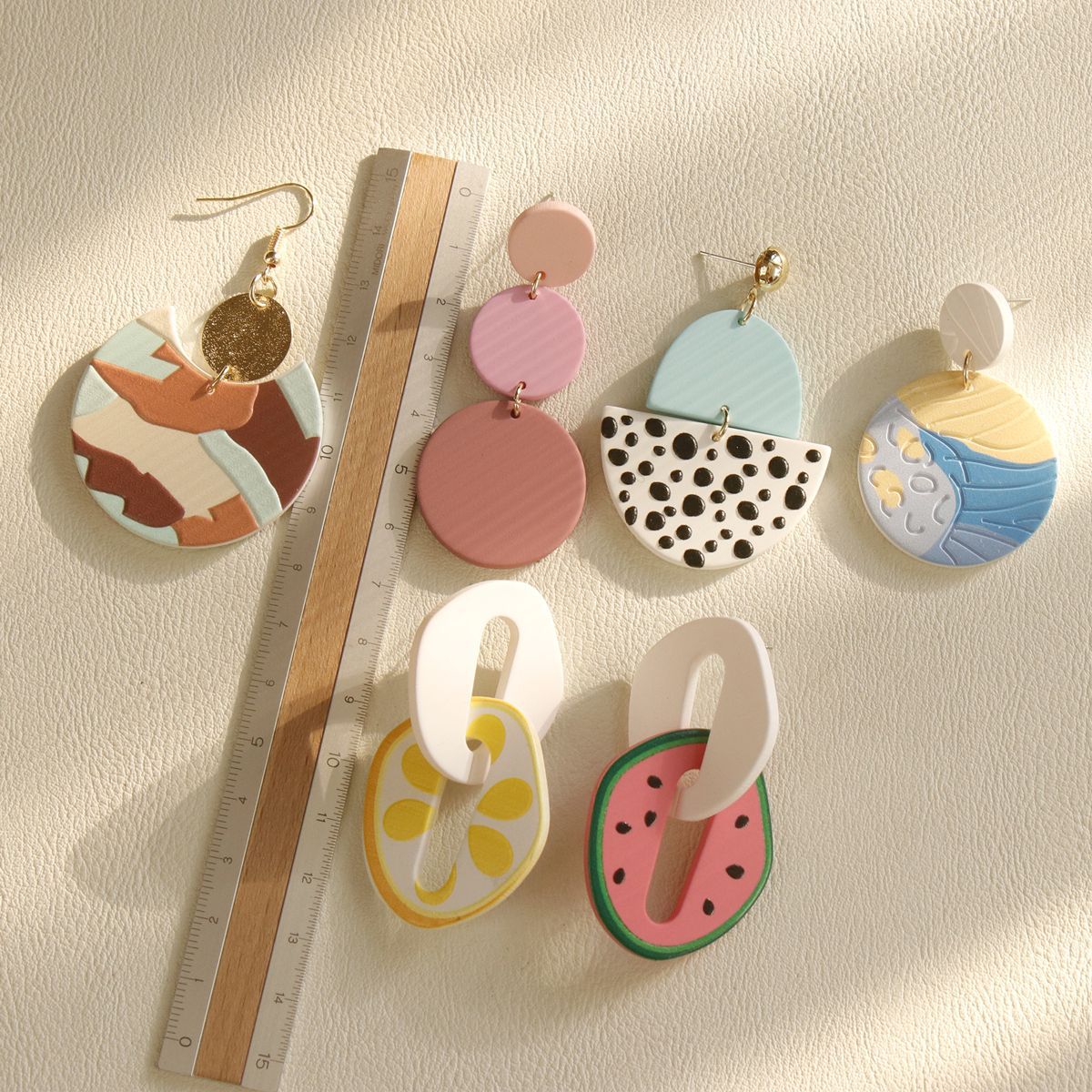 Material:AcrylicStyle: fashion and simplicityFeatures: teardrop shapeColour: pink gradient, watermelon, lemon, blue black spots, yellow planet, gap garden