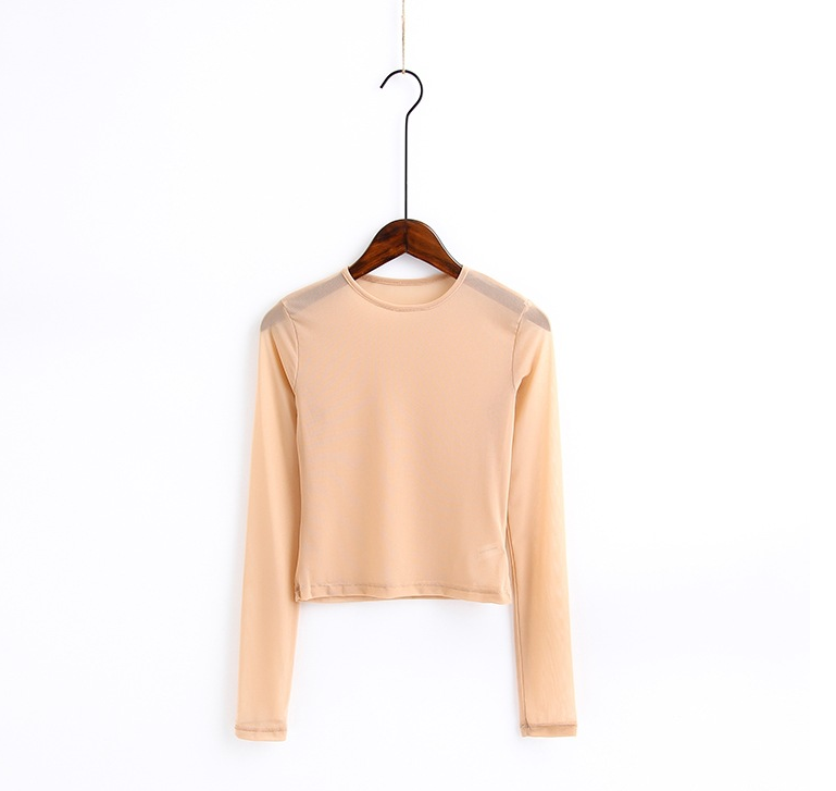 New Spring And Summer Solid Color Sexy Round Neck Long-sleeved Mesh Perspective Women's Shirt T-shirt High-elastic Inner Bottoming