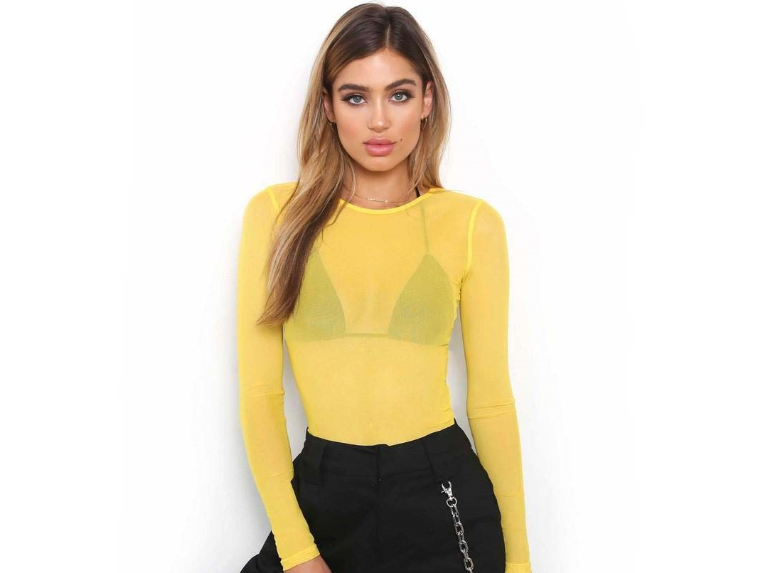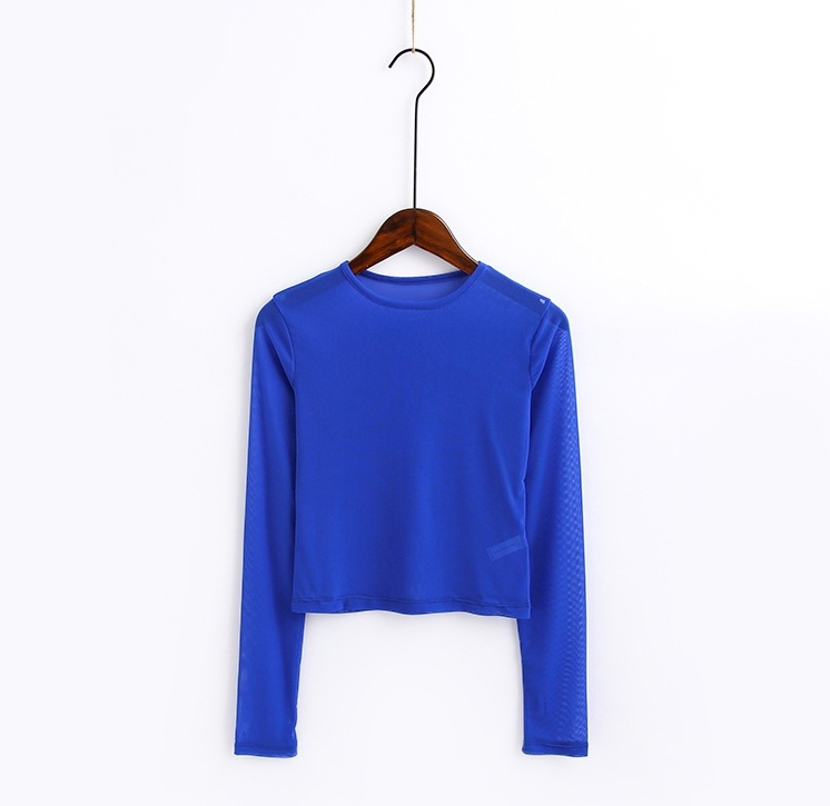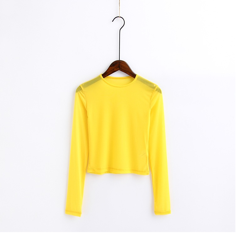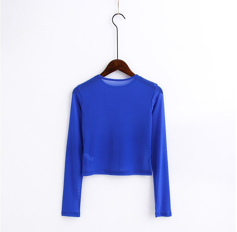 New spring and summer solid color sexy round neck long-sleeved mesh perspective women's shirt T-shirt high-elastic inner bottoming