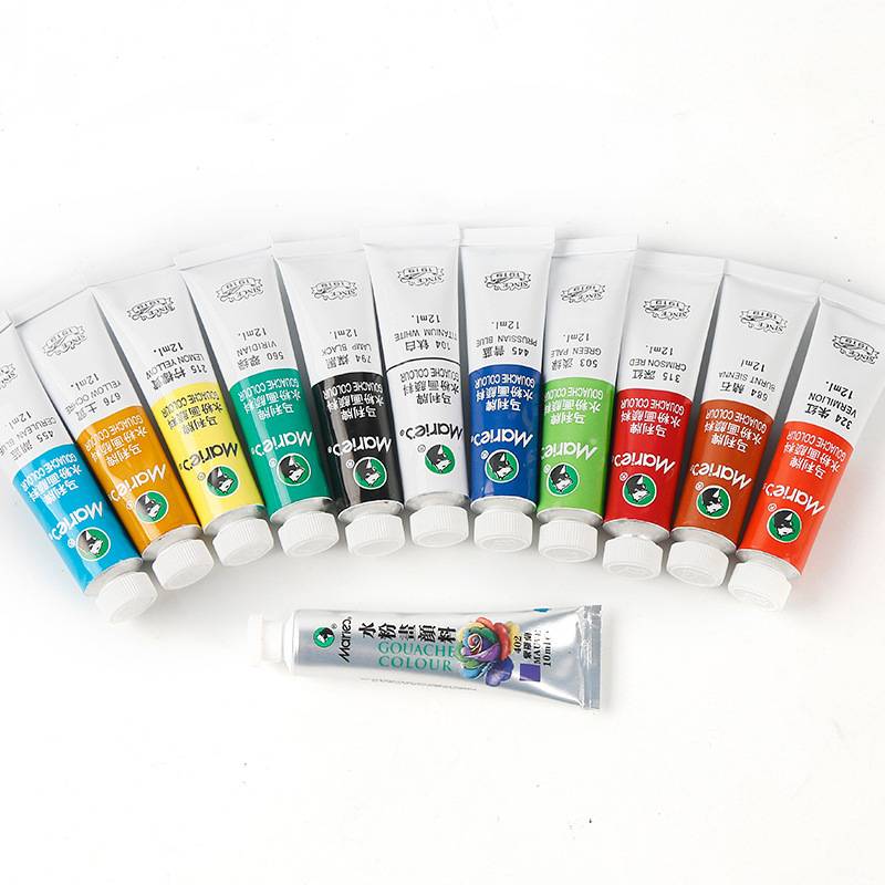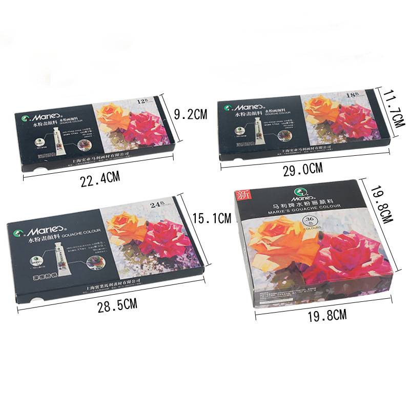 Material: gouache pigmentColor: 12 color x5ml (7612) box water powder, 18 color x5ml (7618) box water powder, 24 color x5ml (7624) box water powder, 12 color x12ml (7312l) box water powder