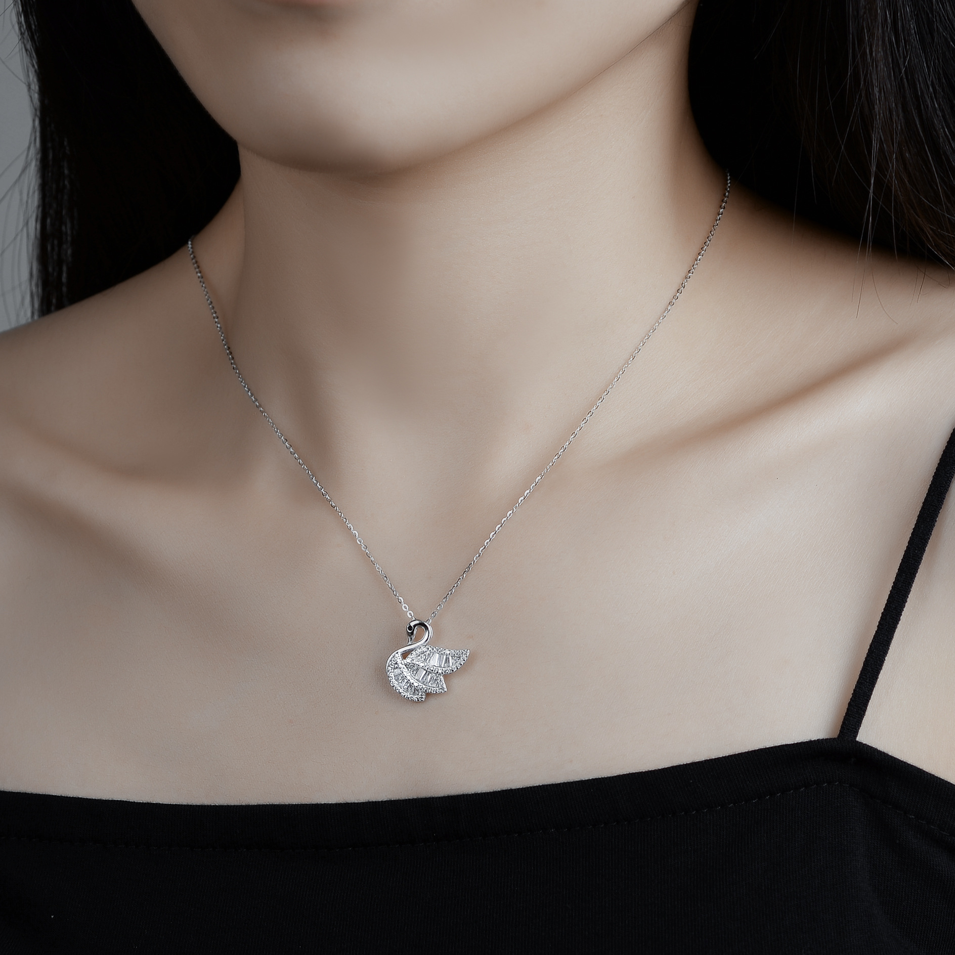 Product information:Treatment Process: Diamond Color: white gold Chain style: cross chain Material: Silver Popular elements: Swan Applicable population: Female Modeling: animal/Zodiac Size: pendant height is about 17mm, width is about 18.6mm