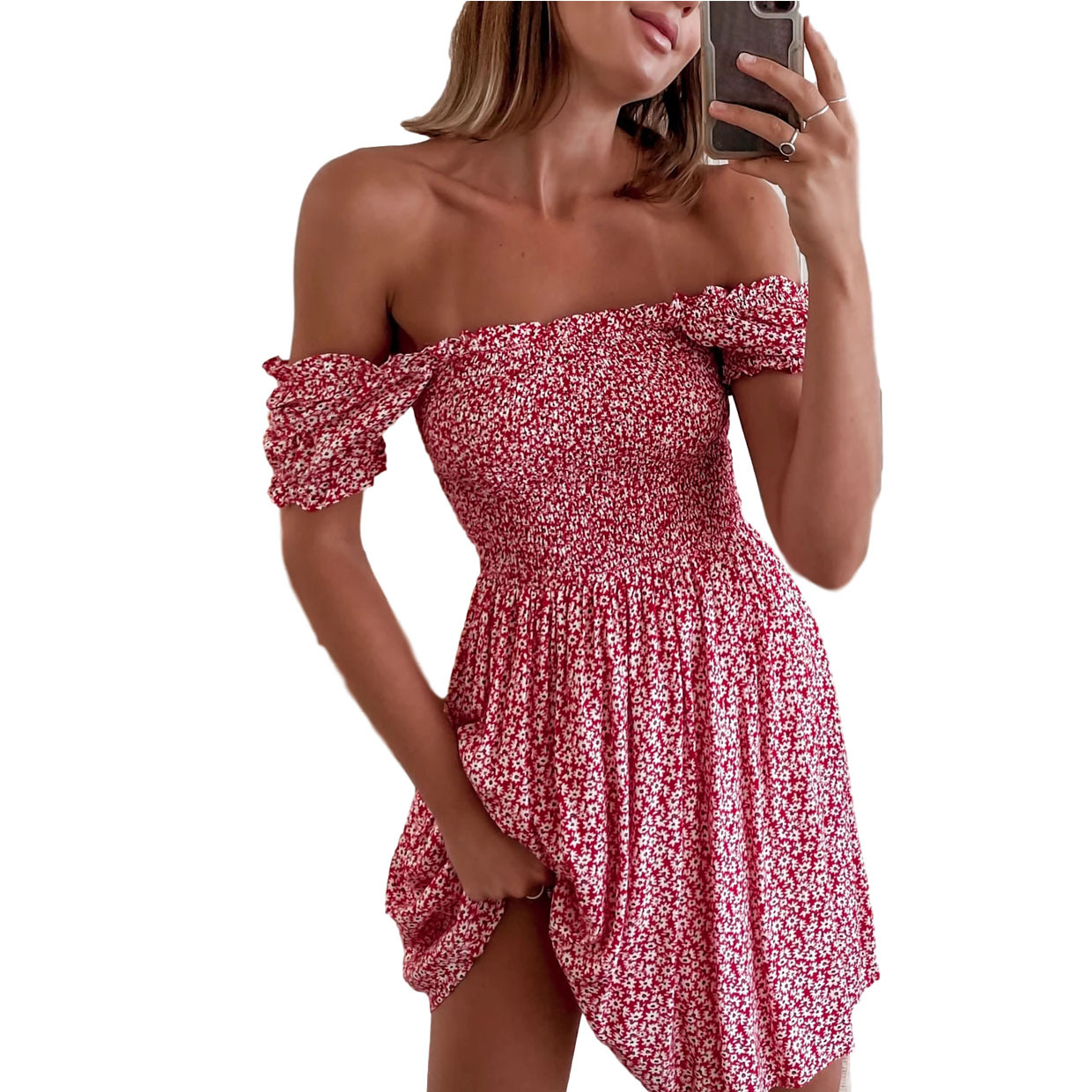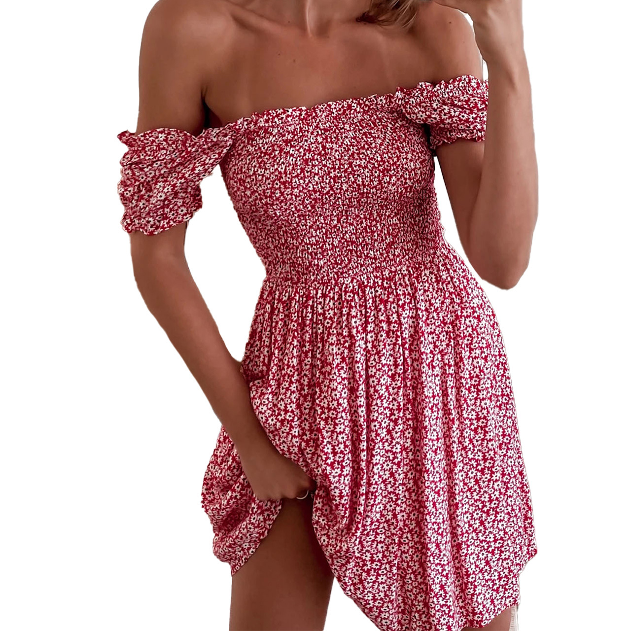 Product information: Pattern: Flowers Color: yellow, red Waist Type: Mid waist Size: S,M,L,XL Sleeve type: sleeve Main fabric composition: Polyester Fiber (polyester) Sleeve length: short sleeve