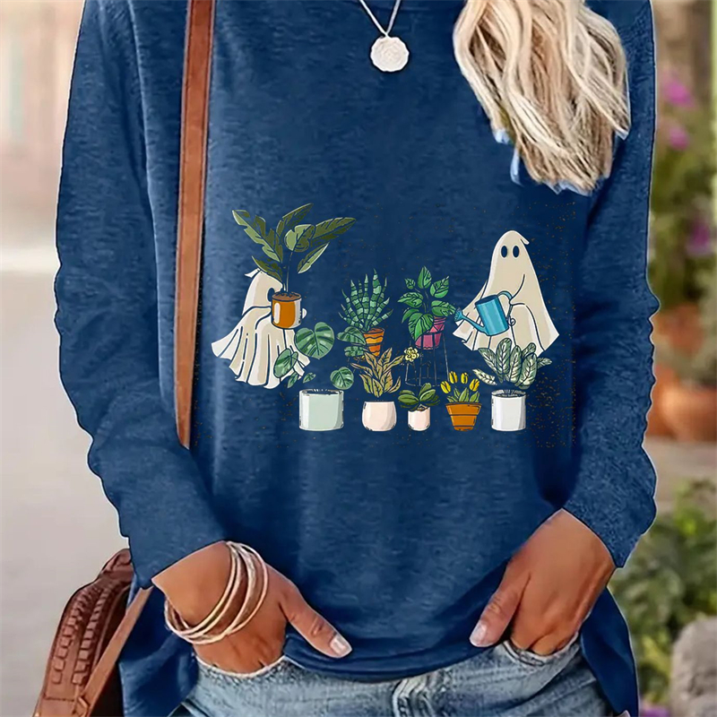 Spring And Autumn Women Casual Simple Pattern Printed Round Neck Long Sleeve T-shirt