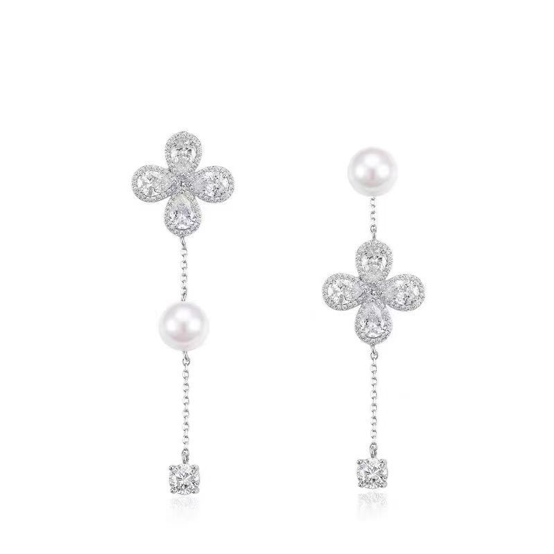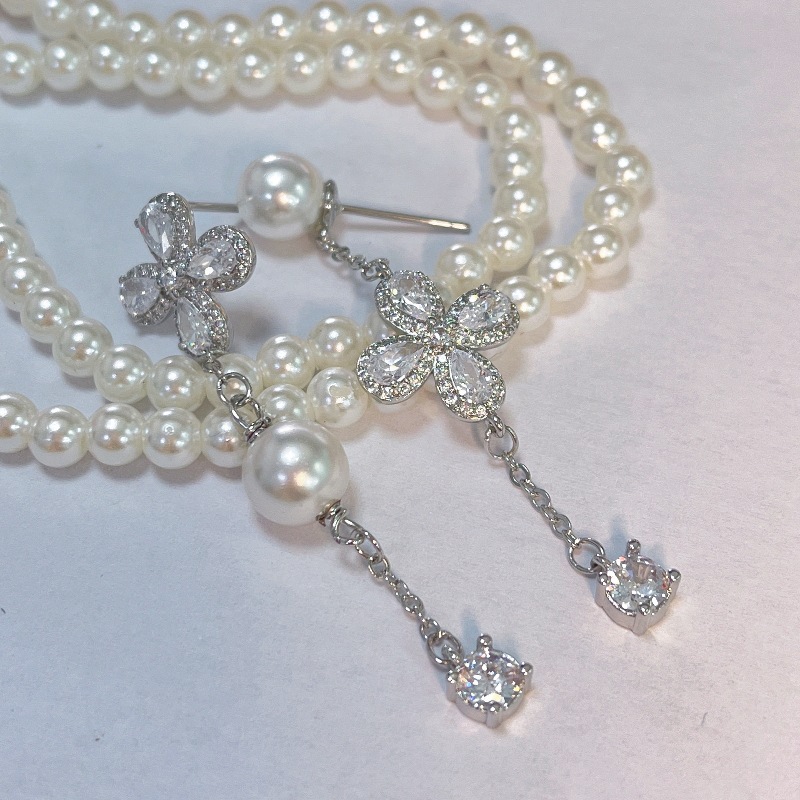 Asymmetric Flower Pearl Tassel Female Stud Earrings