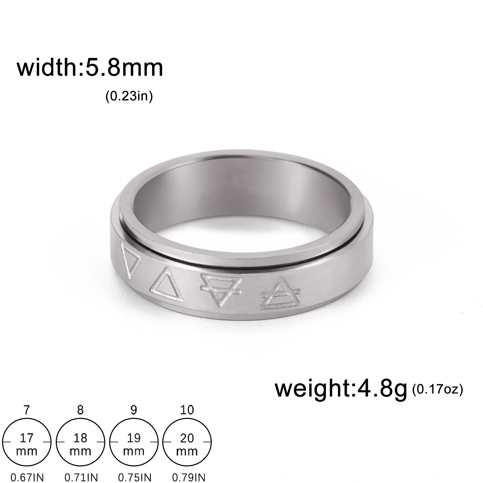 Product information:Type: RingTreatment Process: ElectroplatingColor: steel, goldSize: no.7, no.8, no.9, no.10Style: rotatable Misumi line pattern ringMaterial: Stainless steelShape: GeometryPopular elements: Triangle