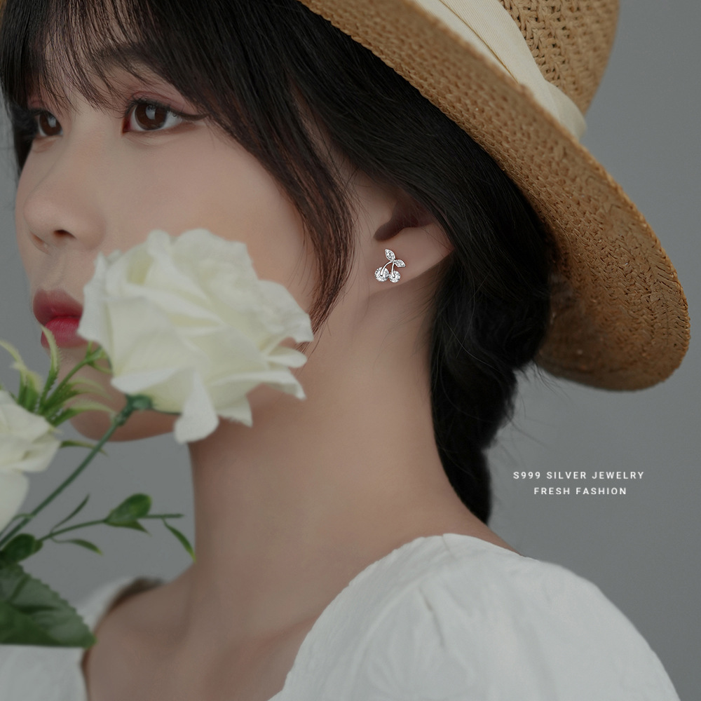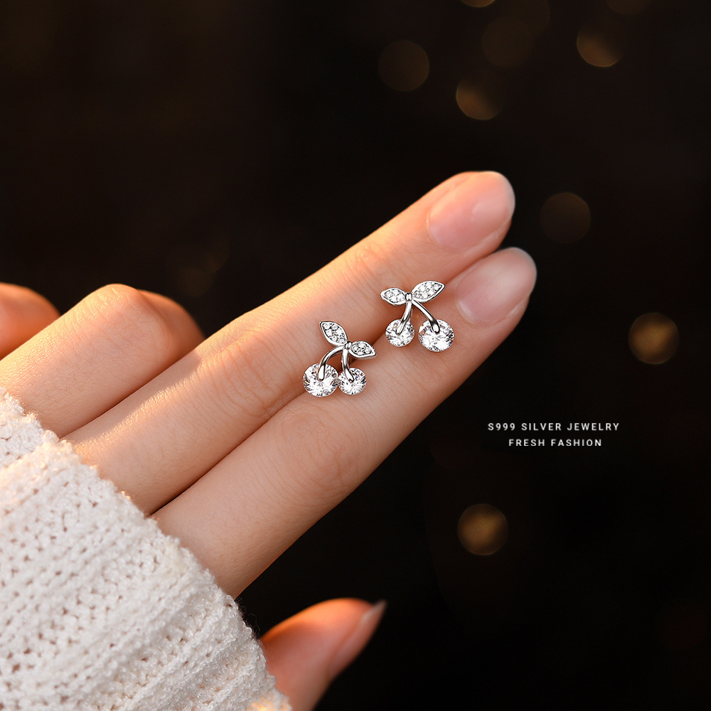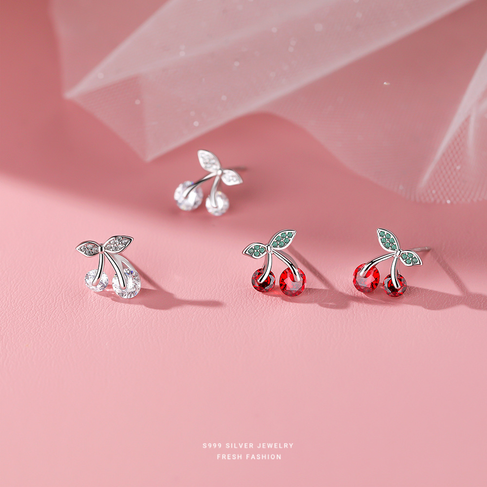 Product information:Treatment Process: inlayColor: white gold color/White zirconium, White Gold color/Red ZirconiumInlaid material: zirconMaterial: SilverPurity: pure silverShape: fruitPopular elements: CherryStyle: classic style