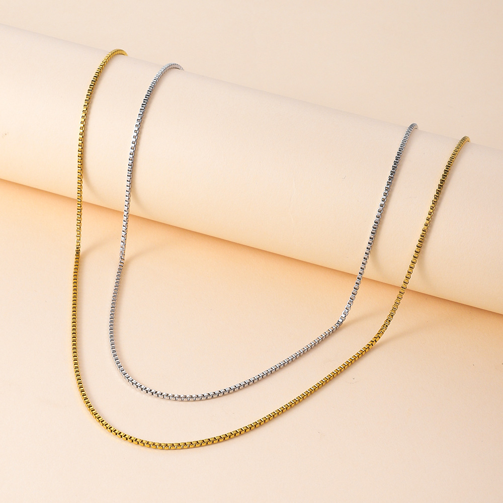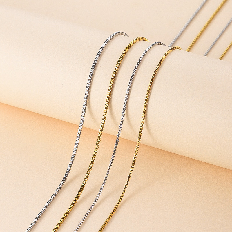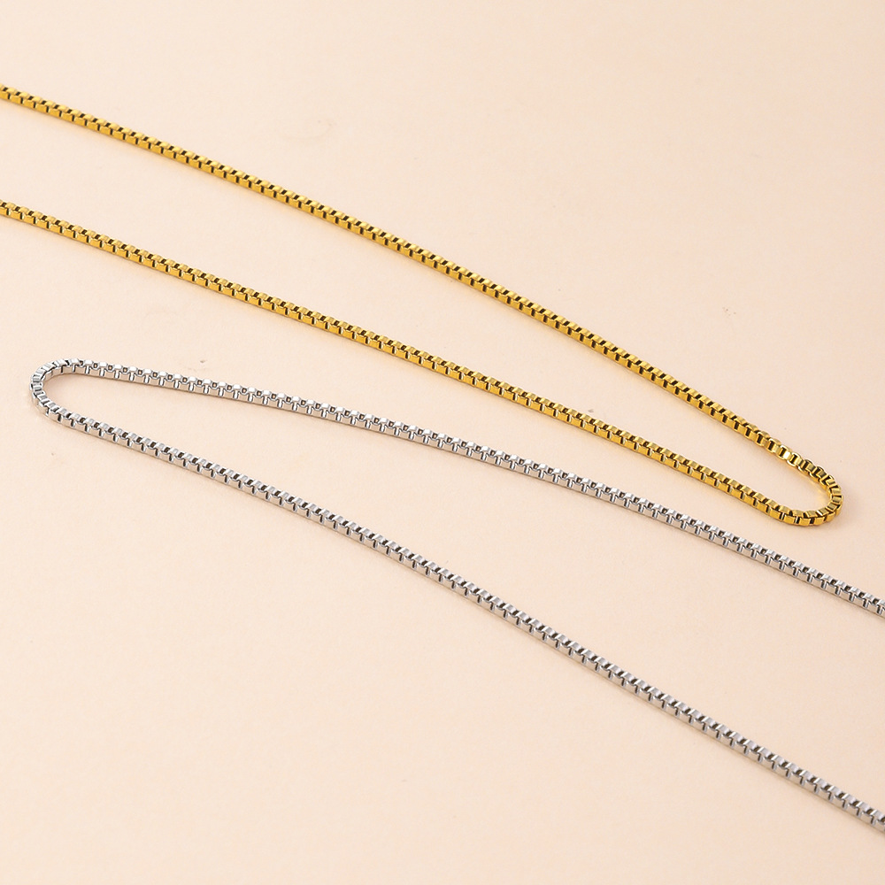 Product information:Treatment Process: Electroplating Color: 2.0mm box chain (rigid color/colorfast) Applicable people: Unisex Chain style: Box chain Material: titanium steel Size: 50CM