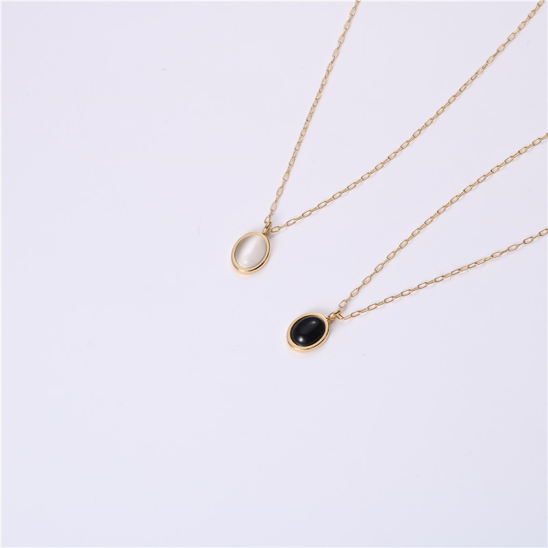 Material: titanium steelType: NecklaceStyle: Women'sItem No.: N230Modeling: GeometricPackaging: Individually packedPendant size 1.24X1.0 cmBlack is black cat's eye, white is cat's eyeChain length 41+6 cmMaterial: 316L titanium steel