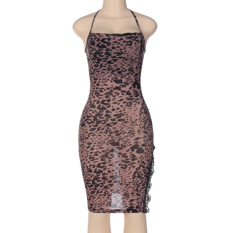 Stitching Mesh Edge Lace-up Halterneck Split Dress