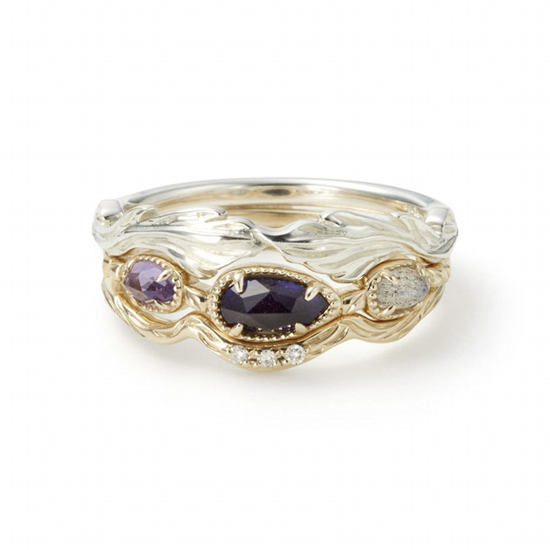 Color::Wave zircon ring, white gold feather ring, starry three-piece set