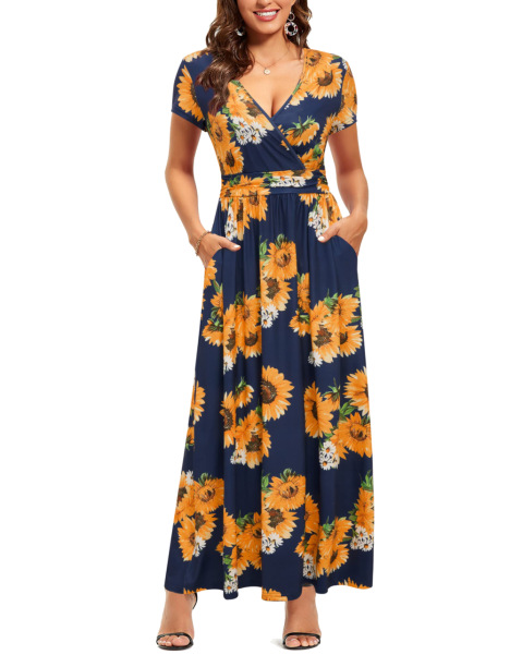Color: black, dark green, green leaves, printed pollen, White Stripes, sunflower navy blue