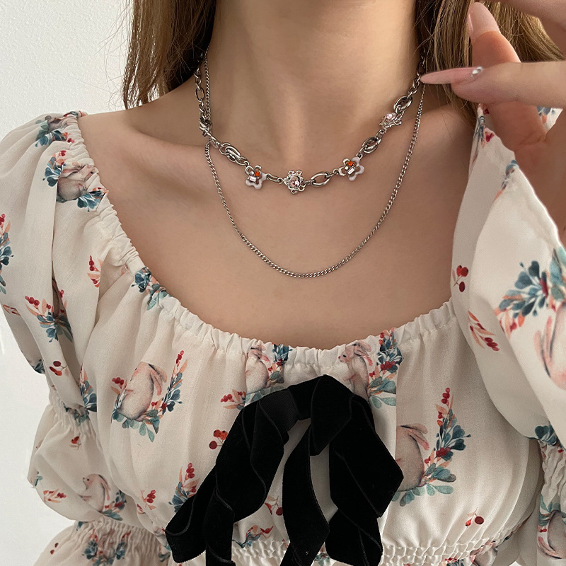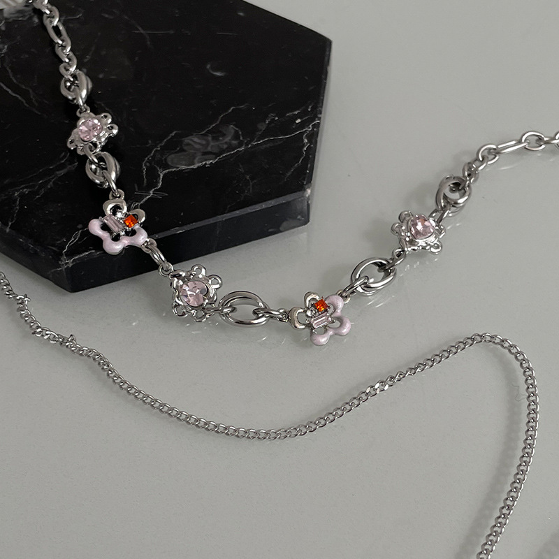 Product information:Color: pink flower necklace, double pink flower necklaceApplicable people: womenPendant material: AlloyChain style: curb necklaceMaterial: titanium steelShape: heart-shaped, flowerPopular elements: FlowersStyle: ins style