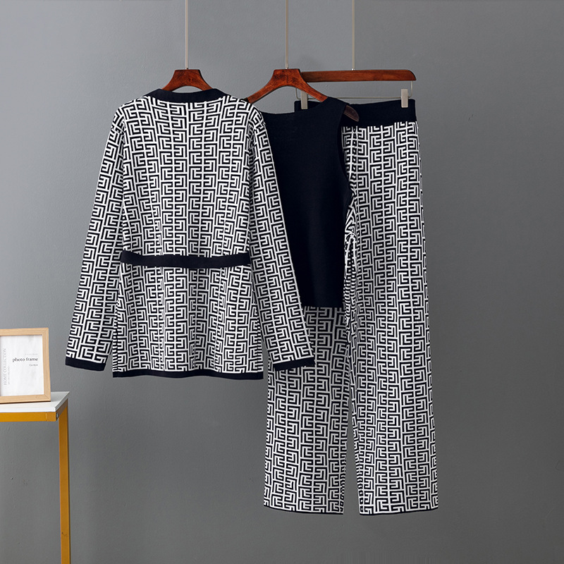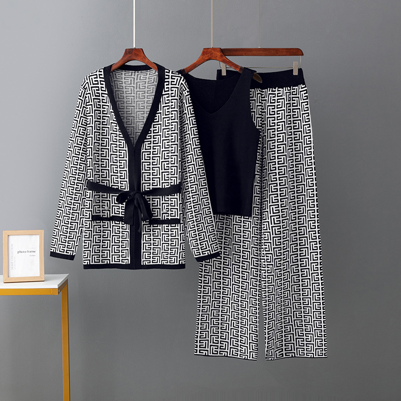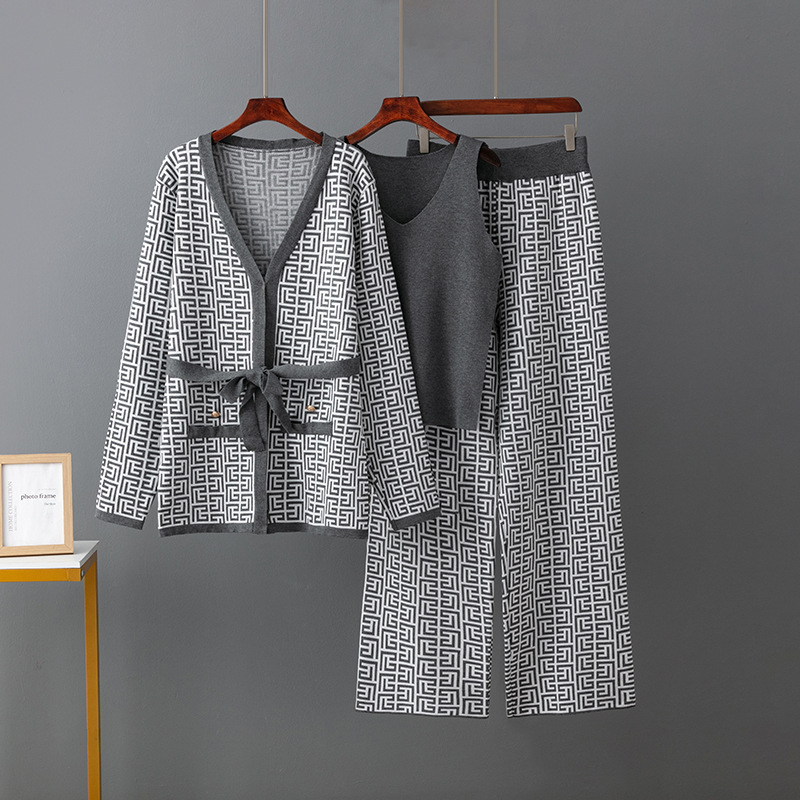 Women's Inverness V-neck Base Knitwear Wide-leg Trousers Three-piece Set