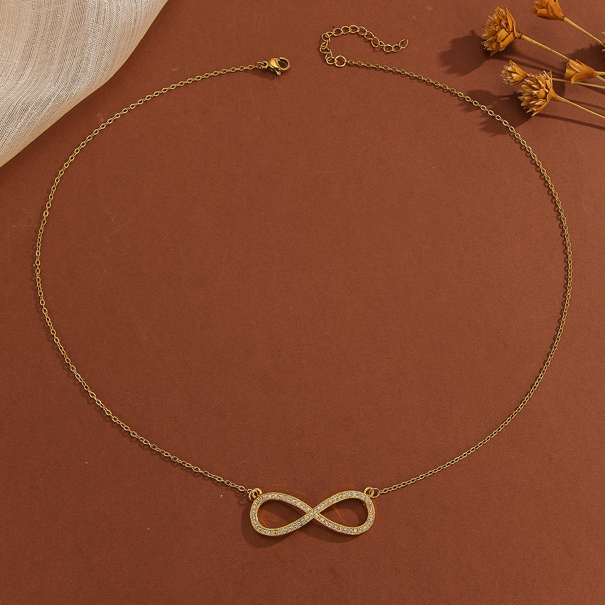 Gold inlaid diamond pendant "∞" infinite symbol design, English letter love pendant necklace, with multiple sparkling diamonds embedded on the edges, and a gold fine chain. The overall design is simple and exquisite, symbolizing eternity and expressing love, with high decorative and aesthetic value
