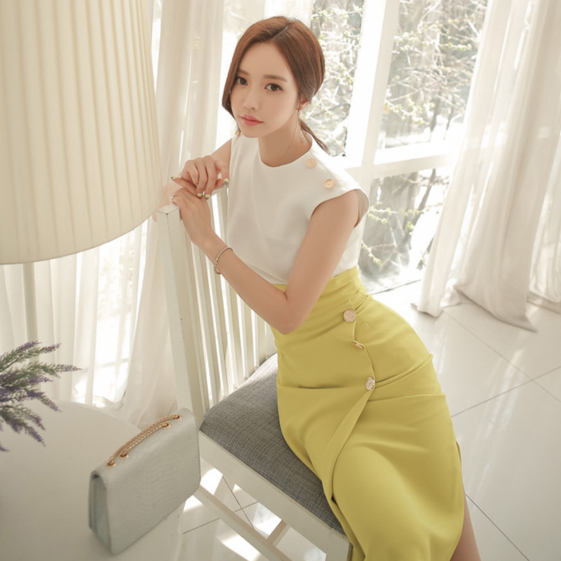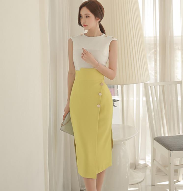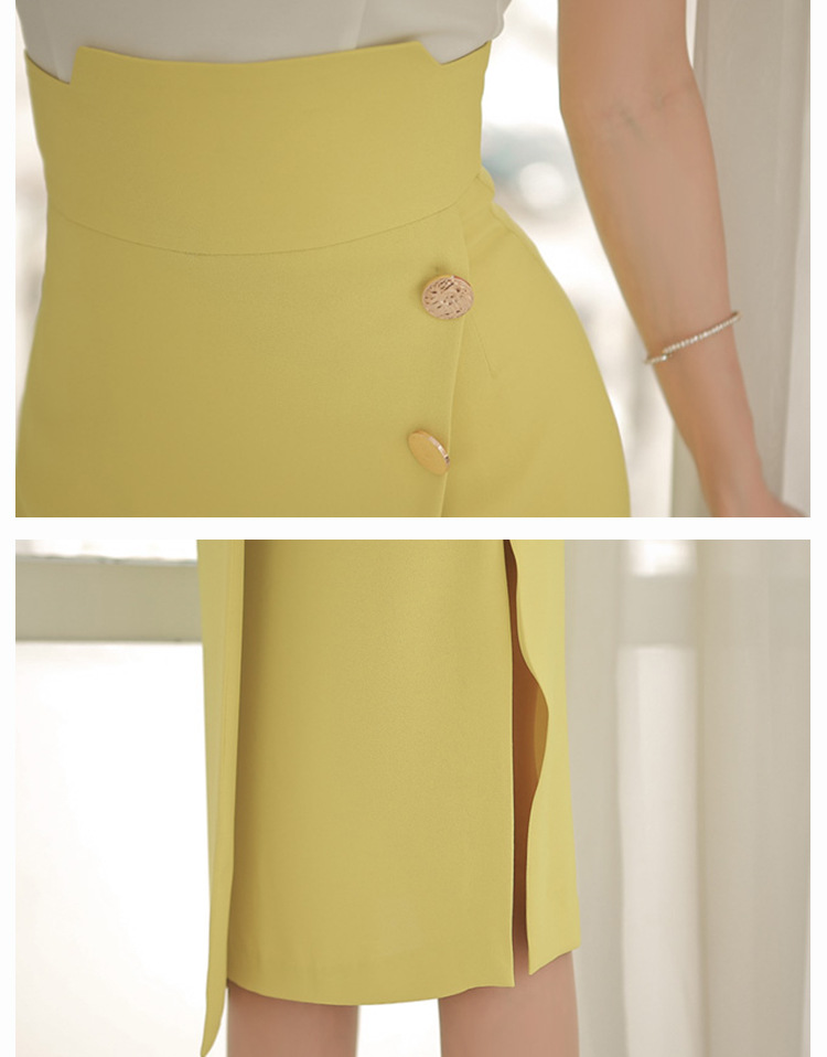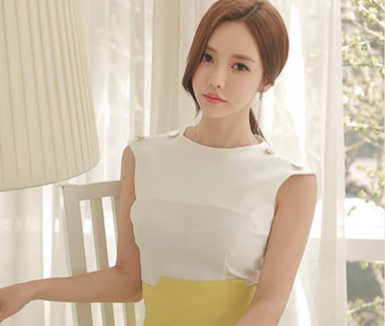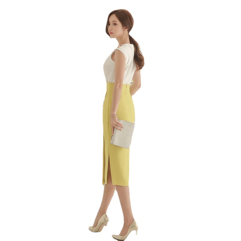 Color: One-piece white sleeveless top, one-piece yellow skirt, two-piece suit