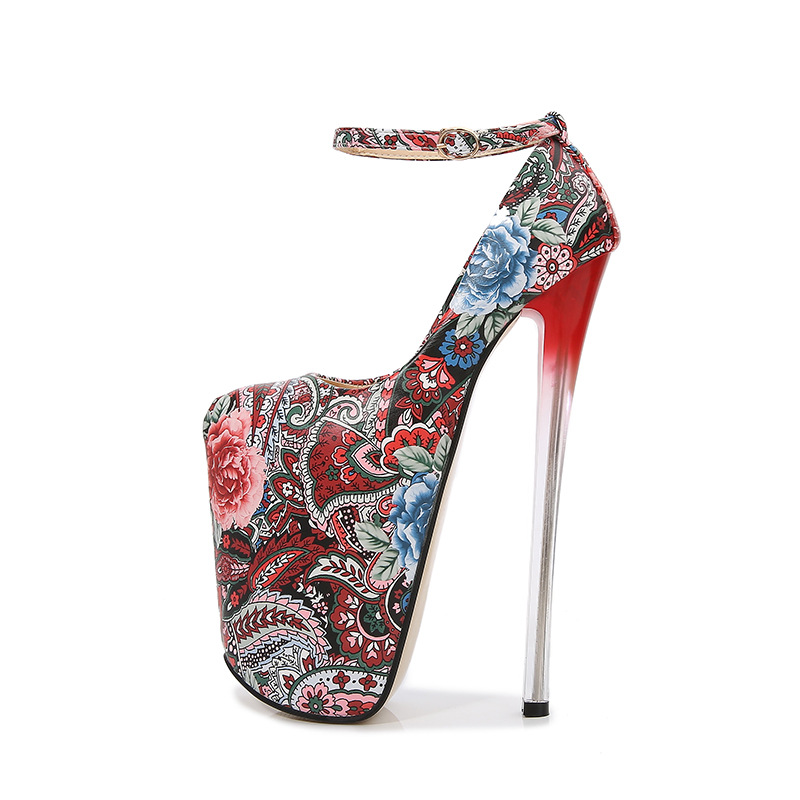 product informationPopular elements: flowers, shallow mouth, buckle, waterproof platformToe shape: round toeUpper Material: Artificial PUStyle: ethnicApplicable gender: femaleHeel height: super high heel (above 8CM)Pattern: Floral