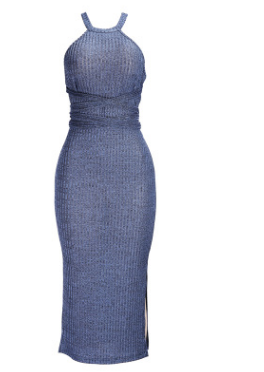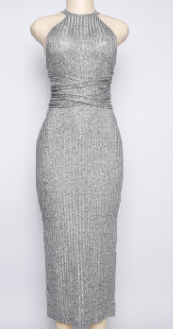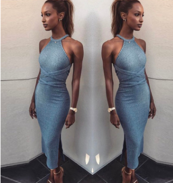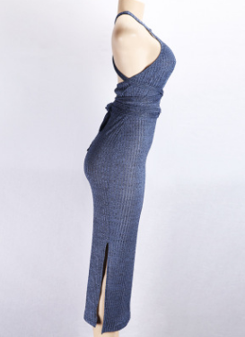 A long, sleeveless, slim dress with a backless tie