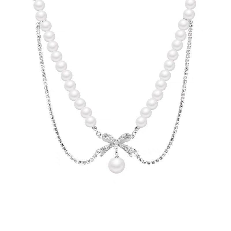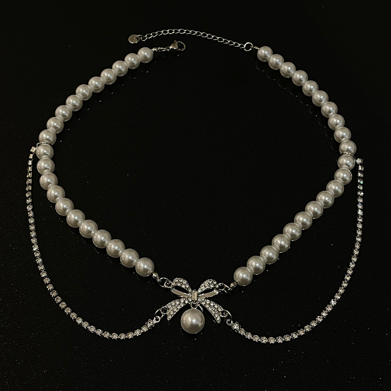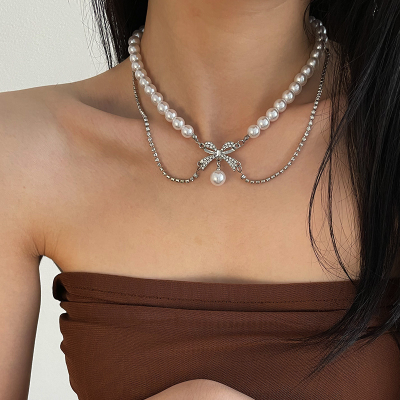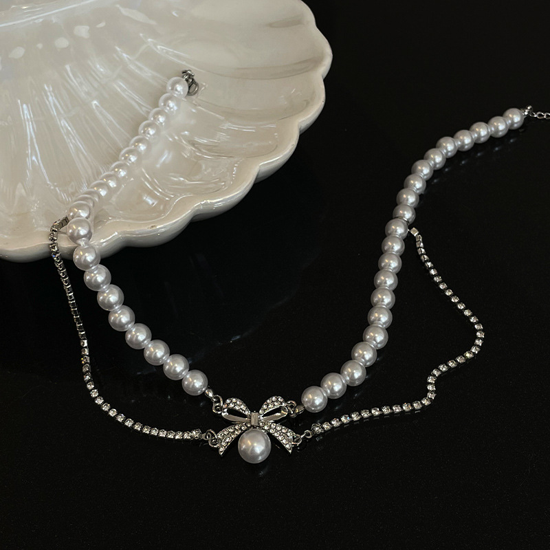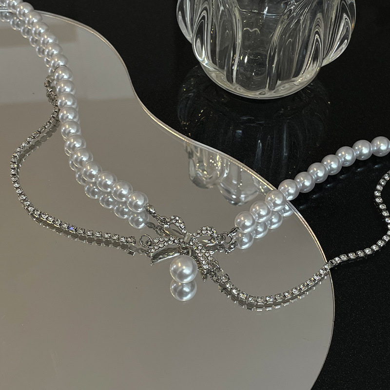 Product information:Color: full diamond bow pearl necklaceApplicable people: womenPendant material: AlloyChain style: clavicle chainMaterial: Imitation PearlStyle: Bow, othersPopular elements: Bow, tasselStyle: sweet and cool