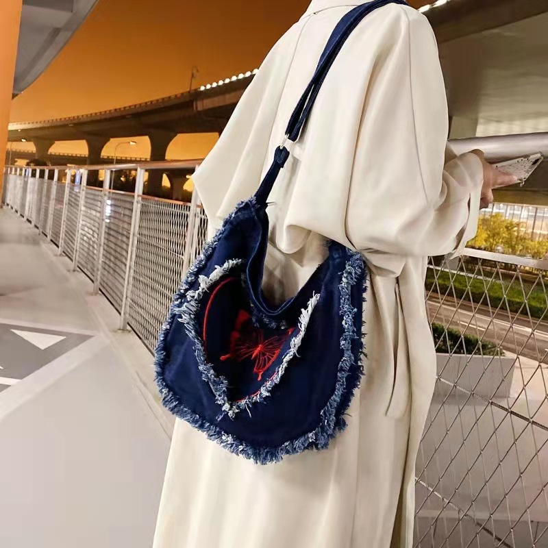 Product information :Color: dark blueStyle: Street trendsMaterial: denimFashion bag style: tassel bagLuggage size: largePopular elements: folds, tassels