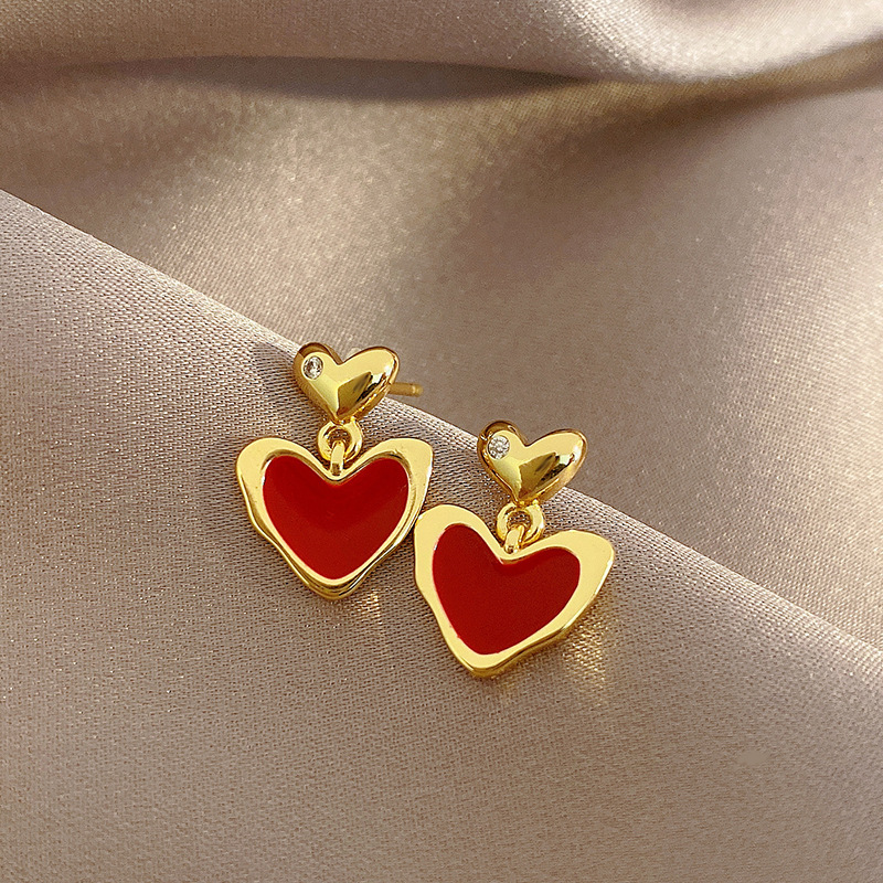 Sterling Silver Needle Red Oil-spot Glaze Love Heart Earrings Women's Retro