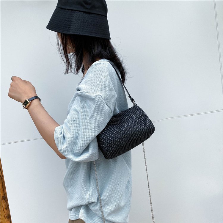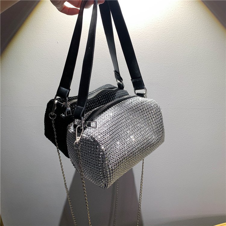 Material: bright diamond, PUHeight: 10cm Width: 17cm Bottom thickness: 10cmShoulder straps are not adjustableLining texture: polyesterBag shape: cylindricalOpening method: zipper