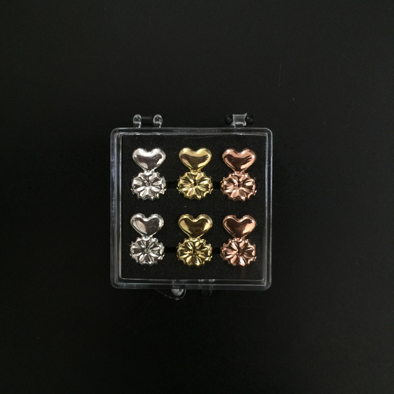 Product Information:Type: Earring aidMaterial: CopperTreatment process: electroplatingSeries: Earring aidSpecifications: three pairs of packaging (copper) flip boxSet: Three pairs (silver/gold/rose gold)