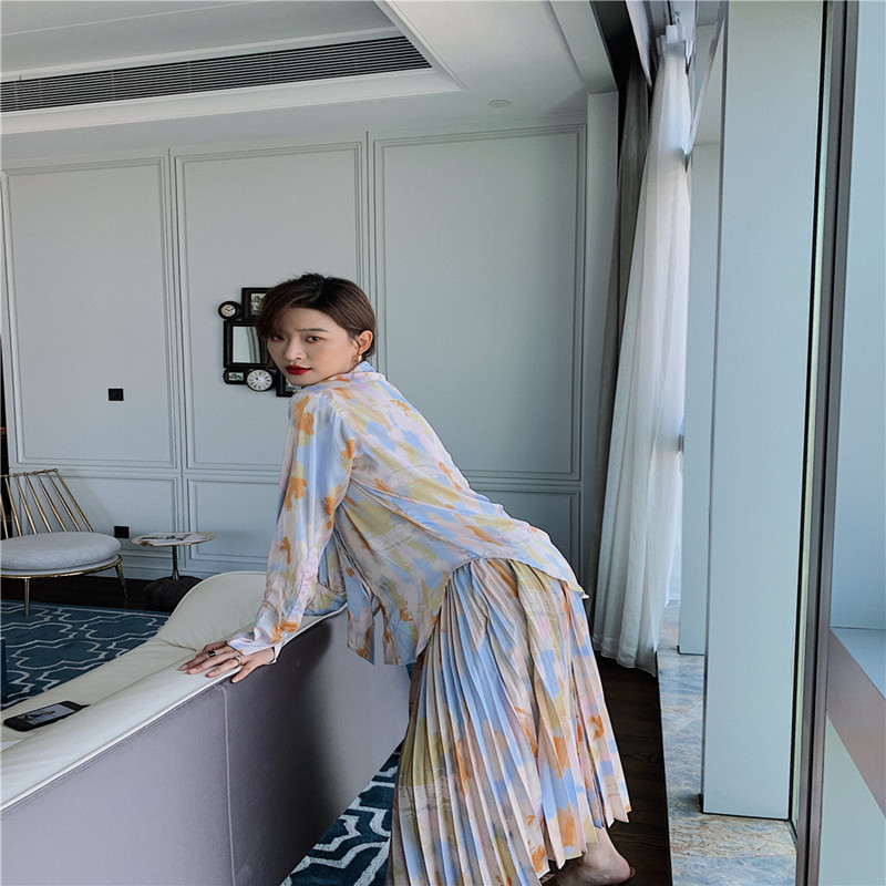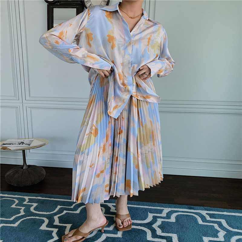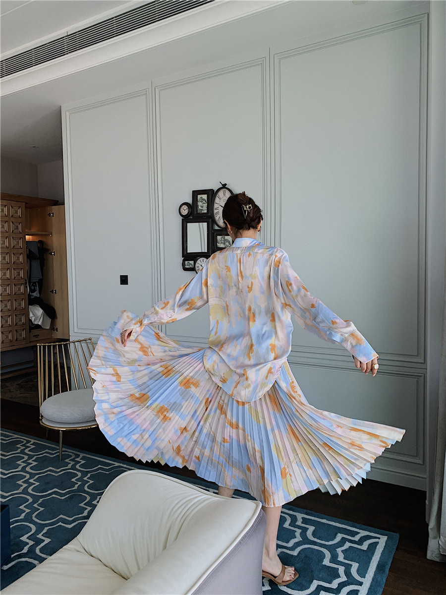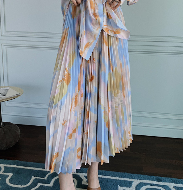 Color: tie-dye shirt, tie-dye pleated skirt