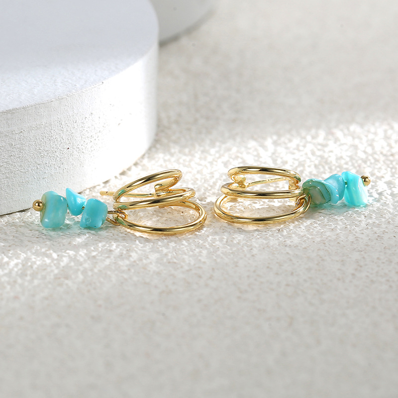 Material: CopperStyle: Women'sShape: C typeTreatment process: electroplatingColor: Gold Triple Hoop Turquoise EarringsSize Information:Package Contents:Earrings X1 pair