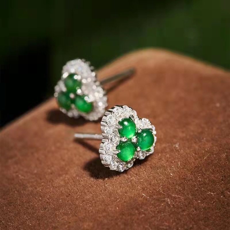 Female 925 Sterling Silver Plated Earrings With Green Egg Shaped Jade Inlay
