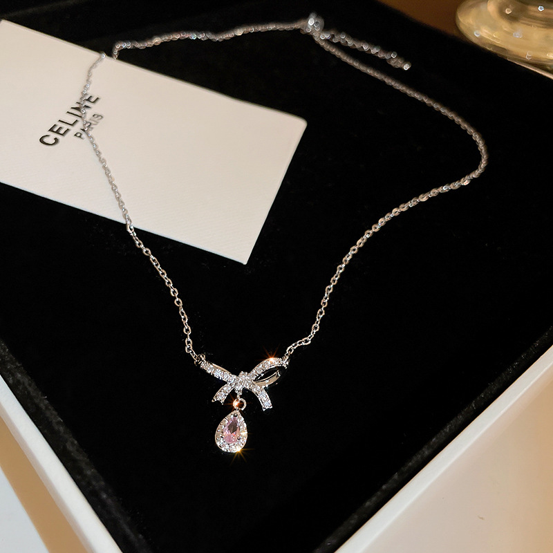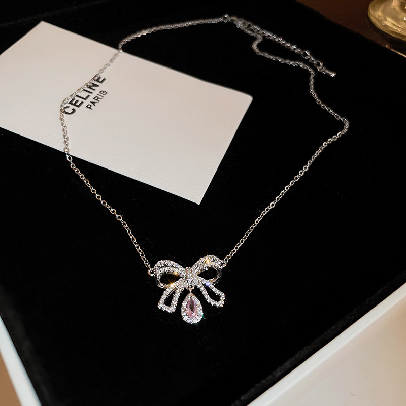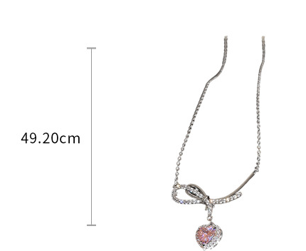 Specifications:Name: Zircon bow heart necklaceMaterial: Copper, zirconSize:43.8+5.4cm,This necklace has a main length of 43.8 cm and an adjustable extension chain length of 5.4 cm