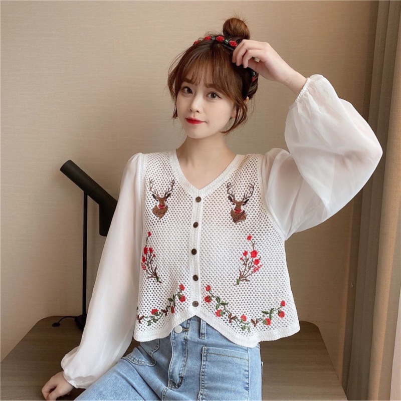 Color: small flower chiffon shirt (white), small flower chiffon shirt (apricot), deer chiffon shirt (white), deer chiffon shirt (apricot)