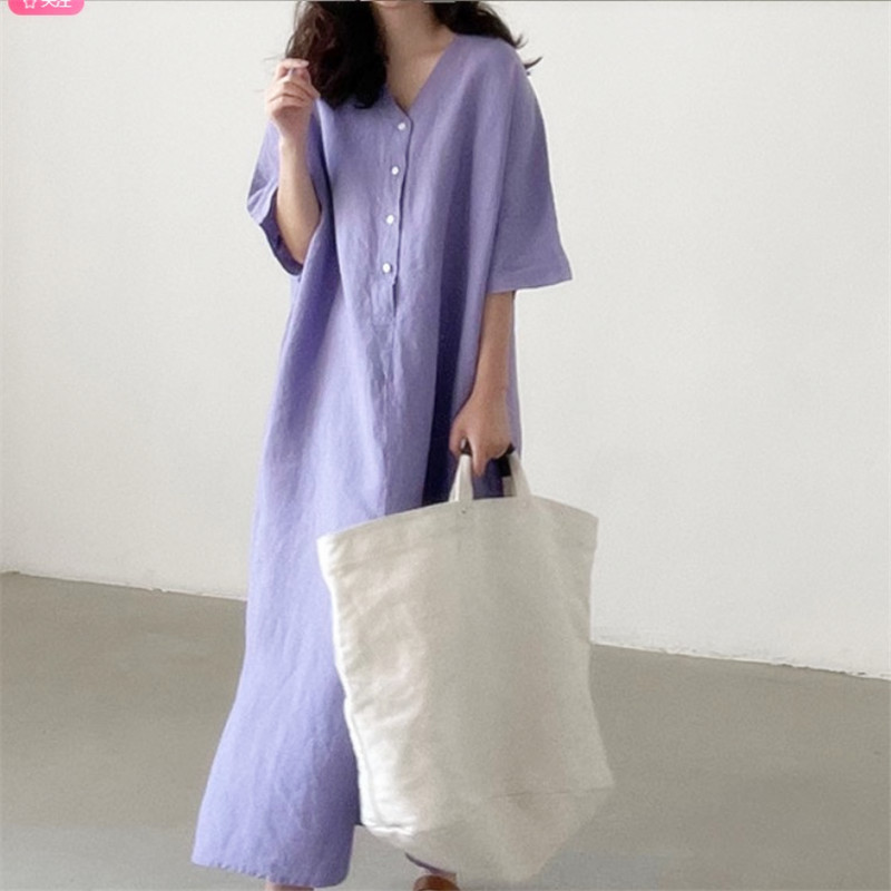 Product information: Pattern: stripes Skirt type: A- line skirt Color: purple Waist type: wide waist Size: S,M,L,XL Skirt length: long skirt Fabric name: cotton and linen Sleeve length: short sleeve Skirt Category: Dress
