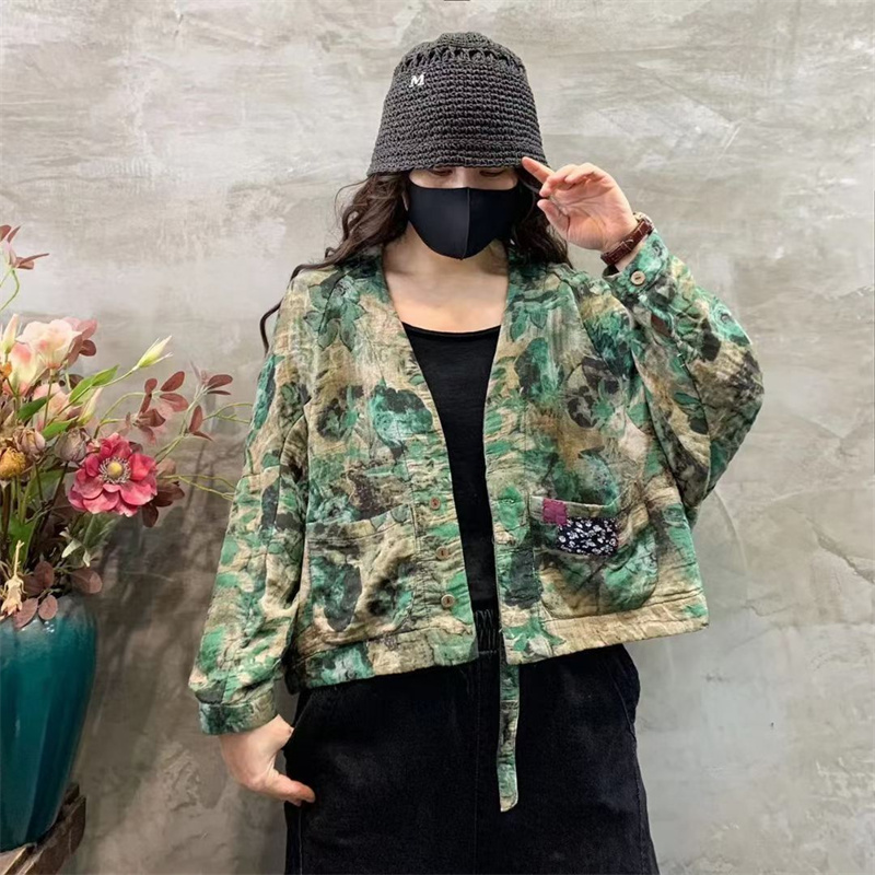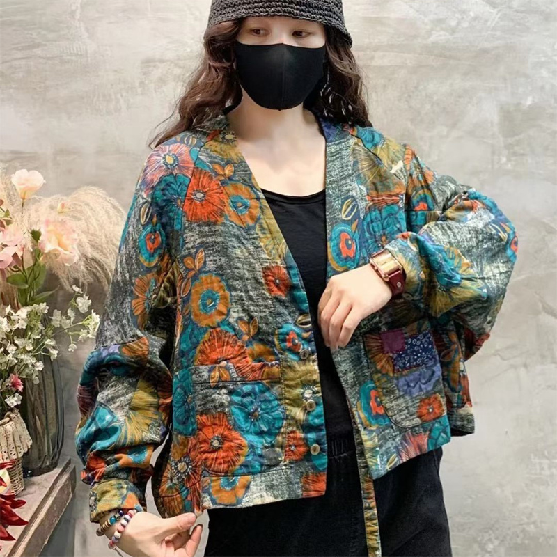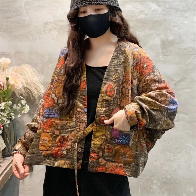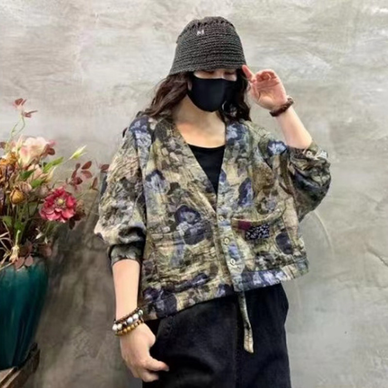 Women's Retro Print V-neck Long Sleeve